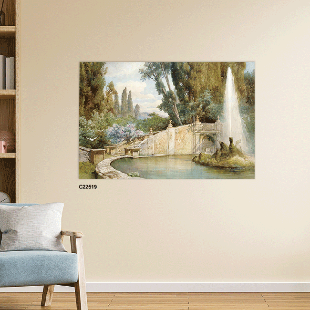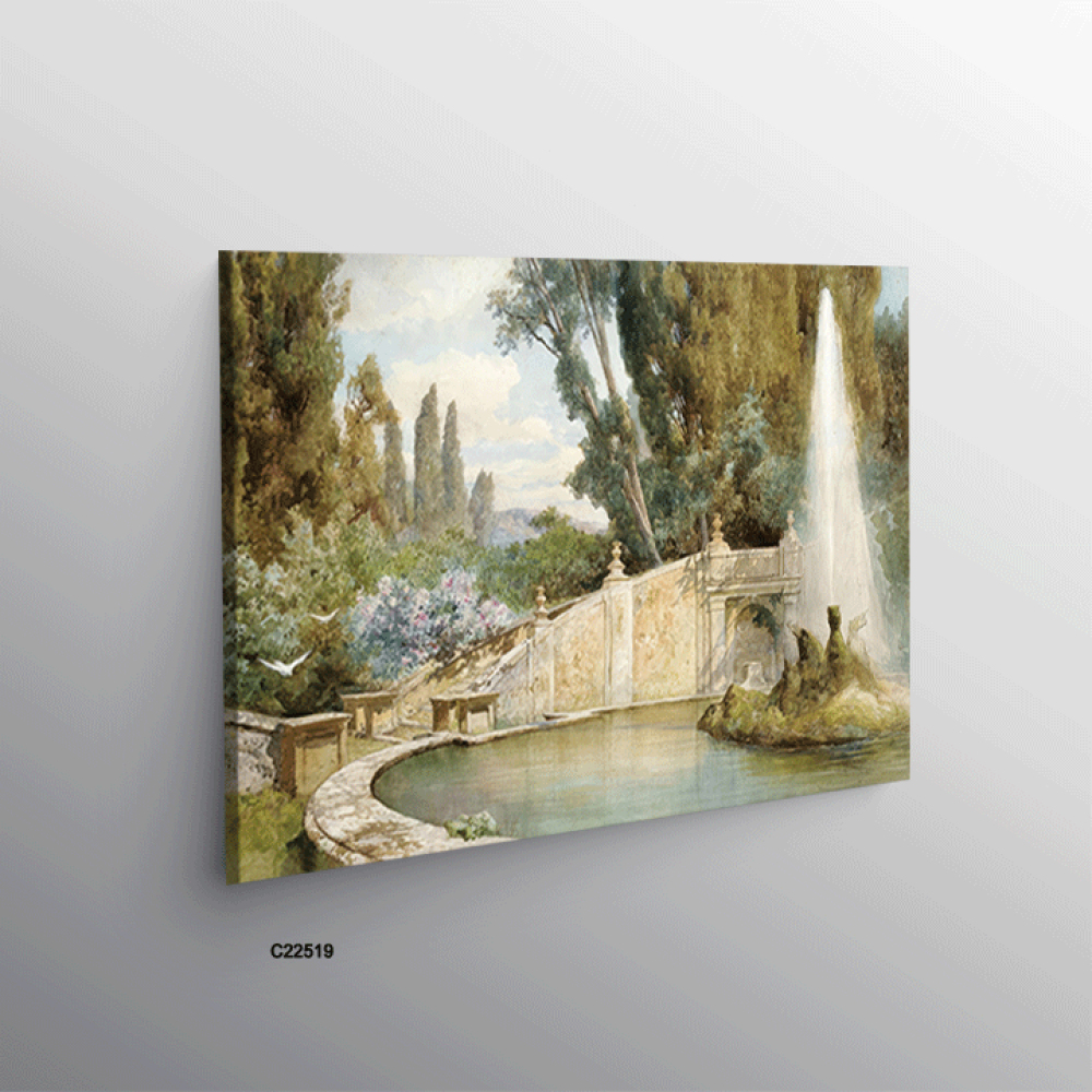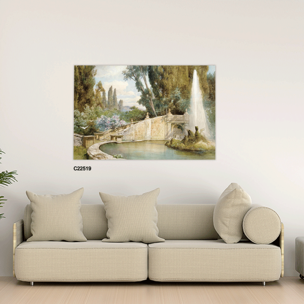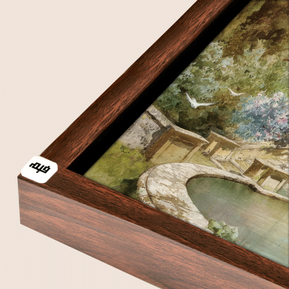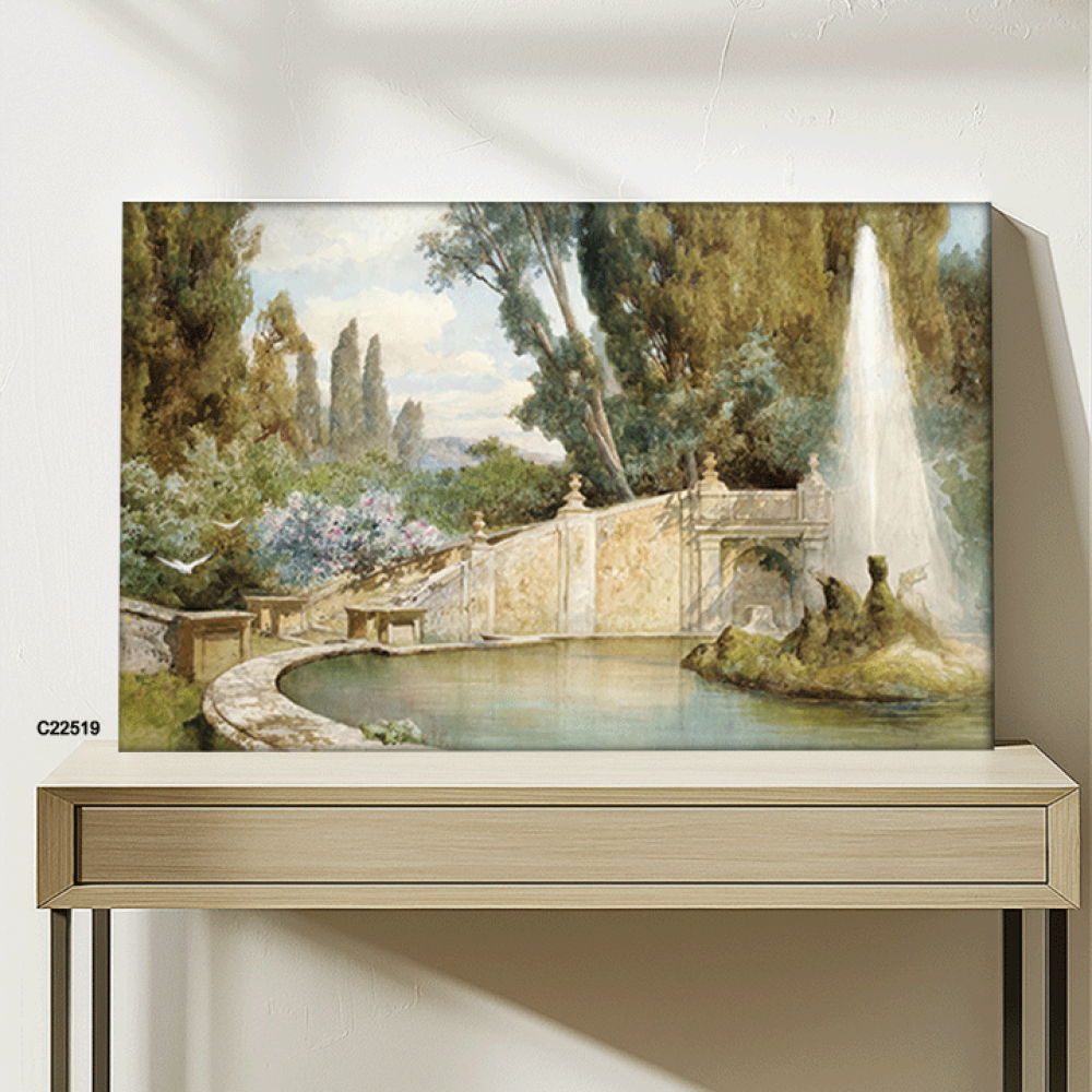 تتألق اللوحة بتصميم مميز يُجسد جزءًا من حديقة جميلة تحتوي على حوض ماء ونافورة وجسر محاط بالأشجار والشجيرات والورود. تبرز الألوان الغنية من الأخضر والب...