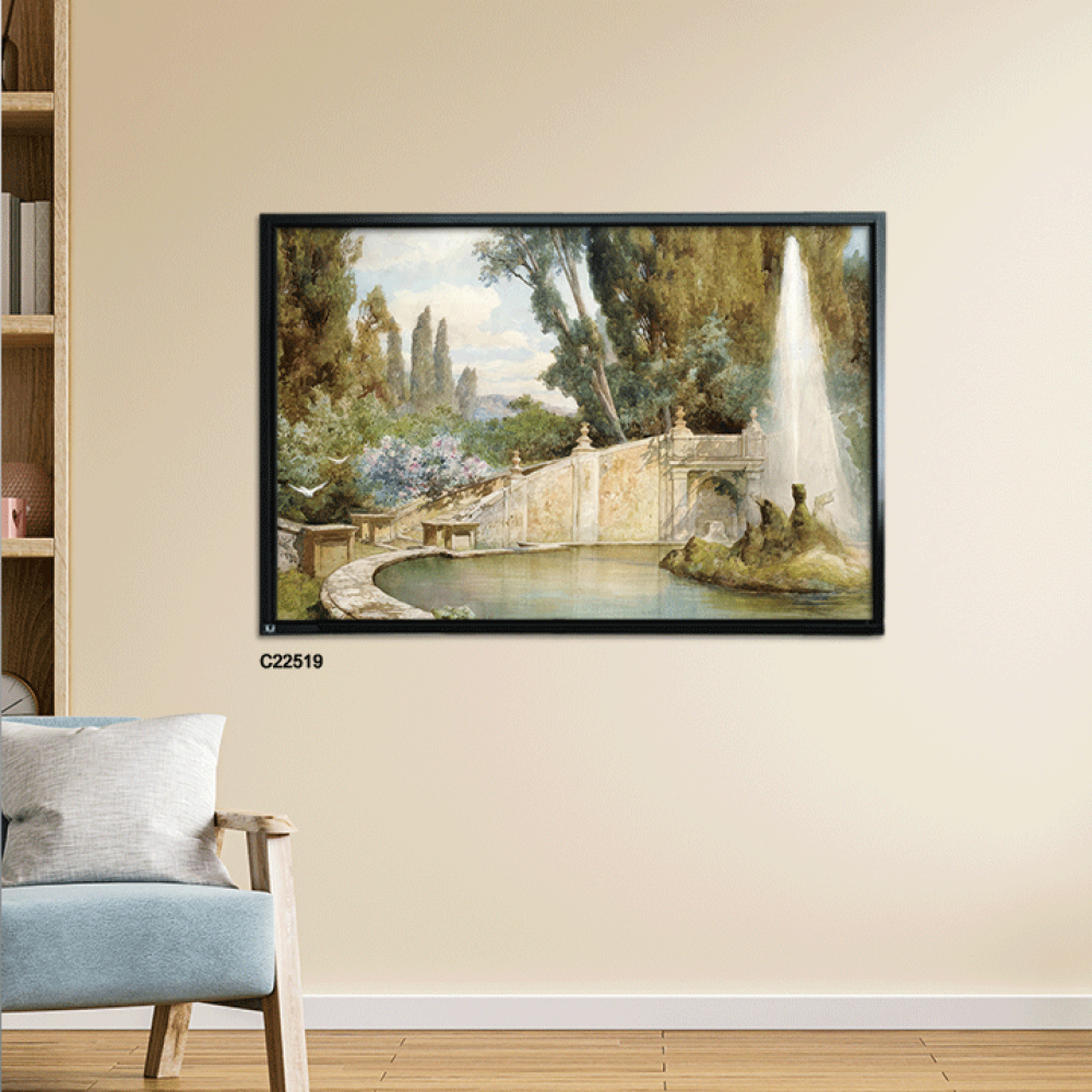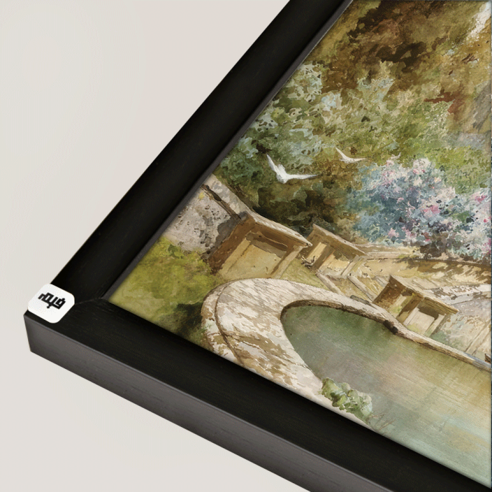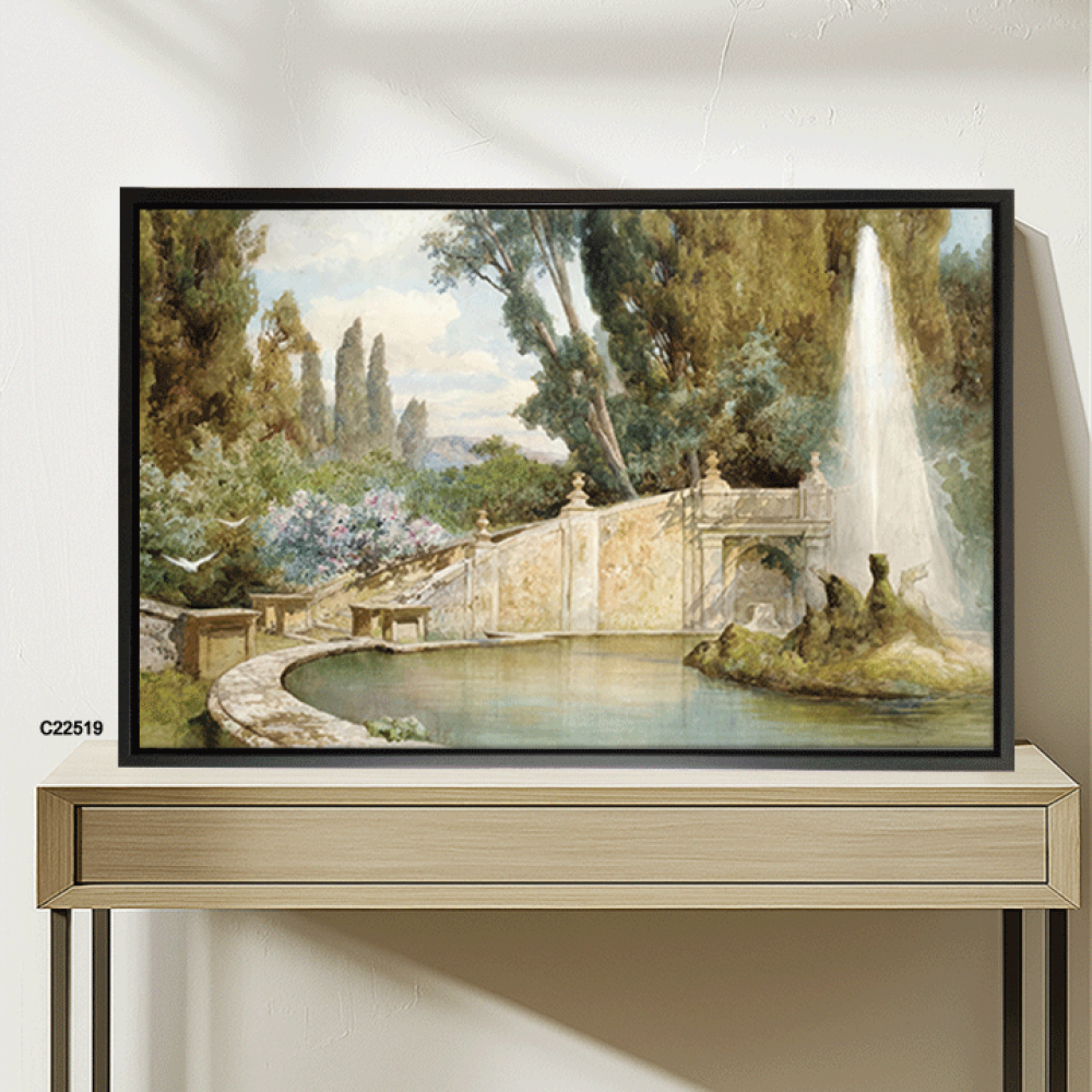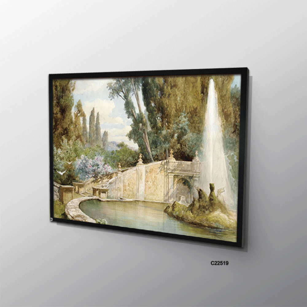 تتألق اللوحة بتصميم مميز يُجسد جزءًا من حديقة جميلة تحتوي على حوض ماء ونافورة وجسر محاط بالأشجار والشجيرات والورود. تبرز الألوان الغنية من الأخضر والب...