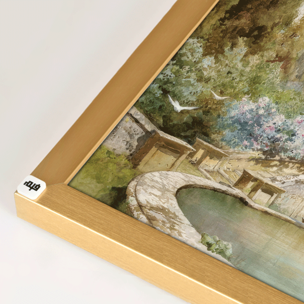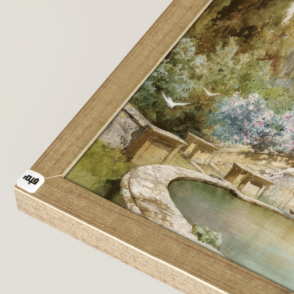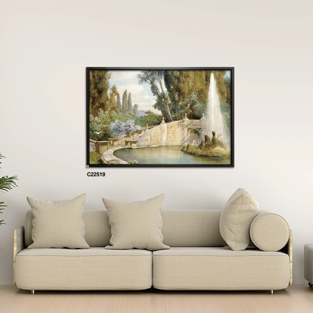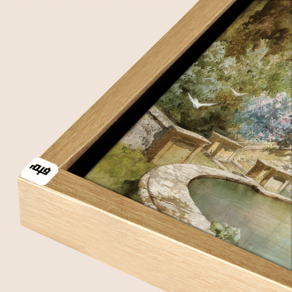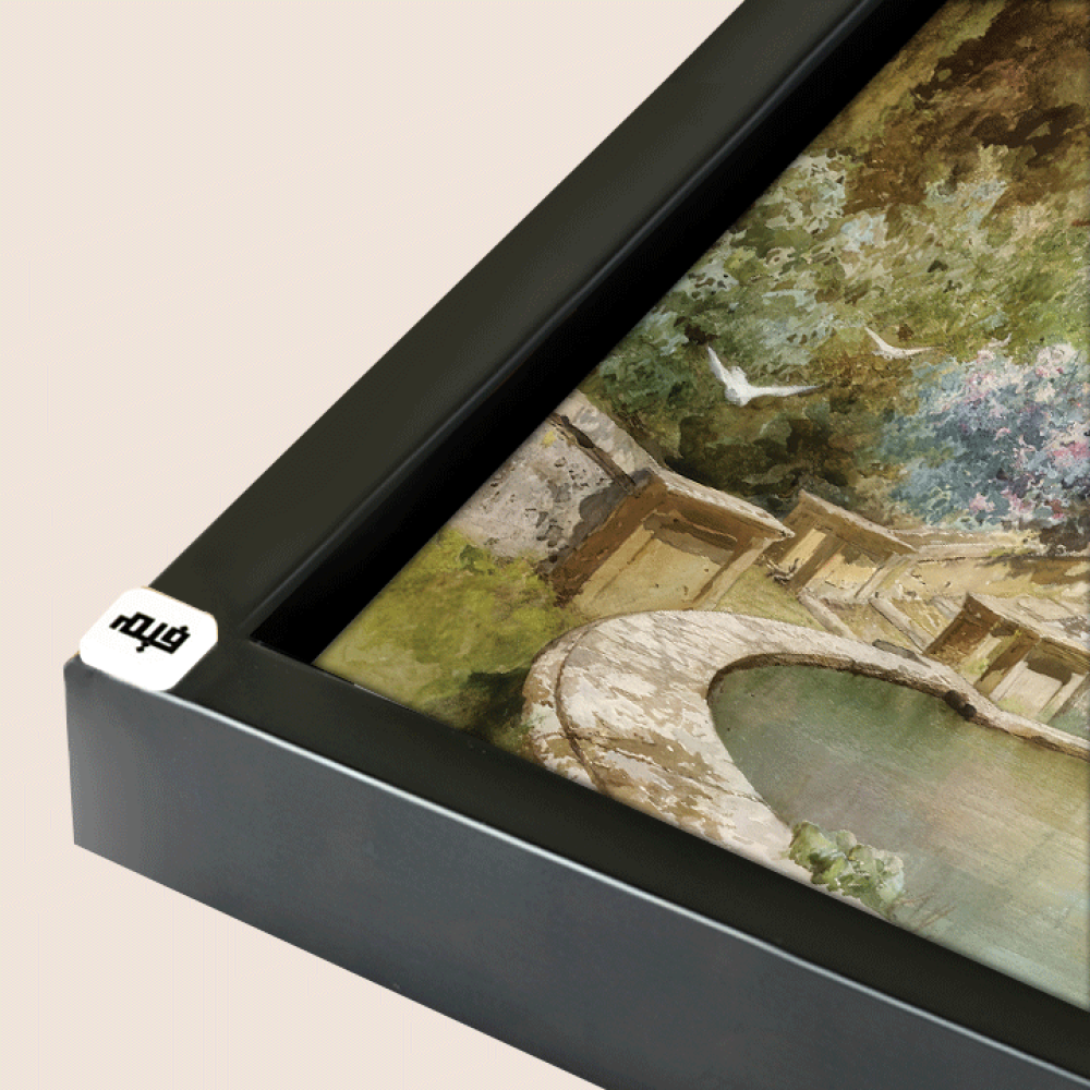 تتألق اللوحة بتصميم مميز يُجسد جزءًا من حديقة جميلة تحتوي على حوض ماء ونافورة وجسر محاط بالأشجار والشجيرات والورود. تبرز الألوان الغنية من الأخضر والب...