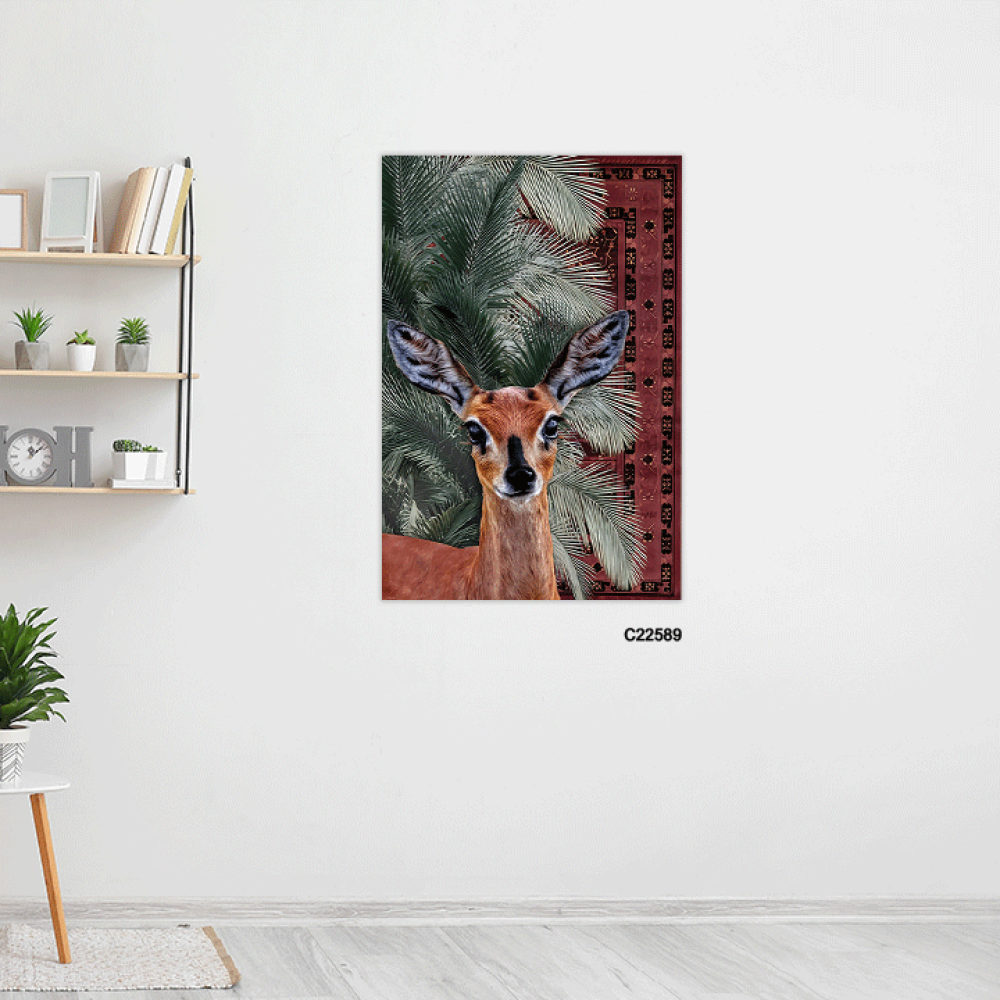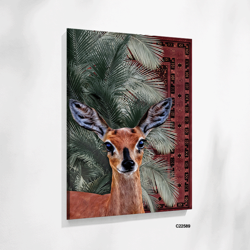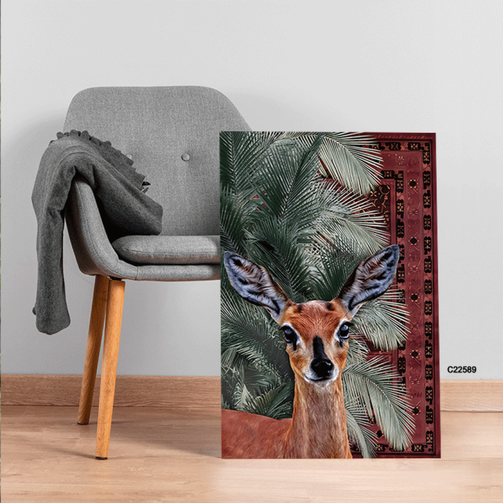 تُعرض هذه اللوحة الجدارية بتصميم فني مميز يجسد صورة غزال بخلفية من سعف النخيل ونقوش السجاد، مستخدمة تدرجات الألوان الأخضر والبني والأحمر والأزرق والرم...