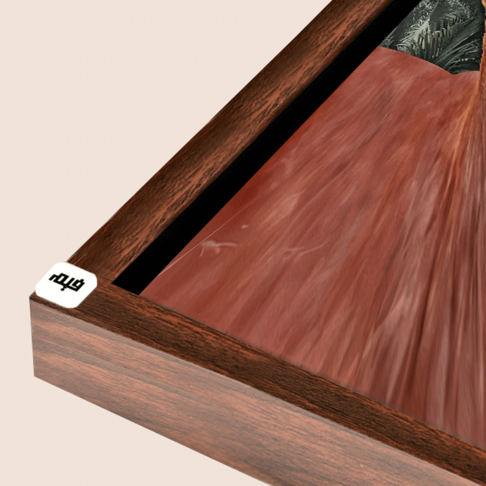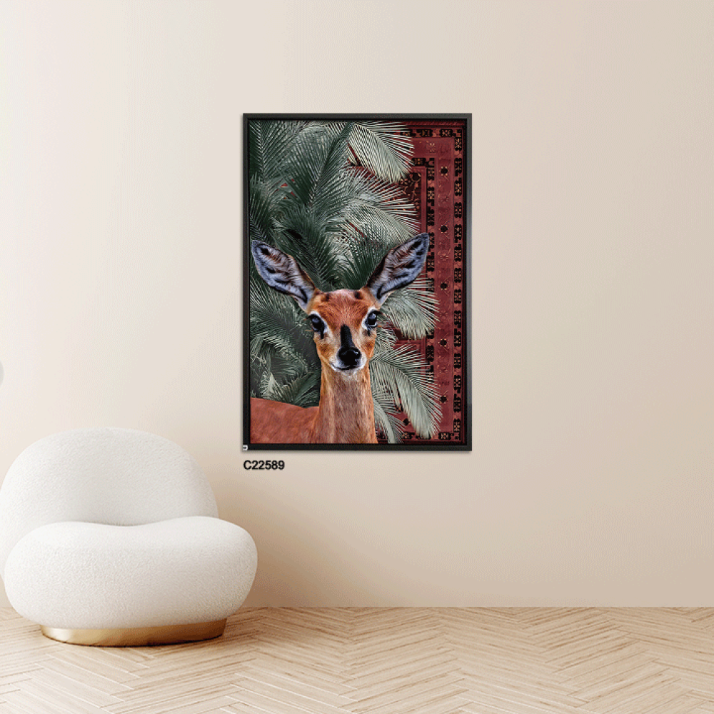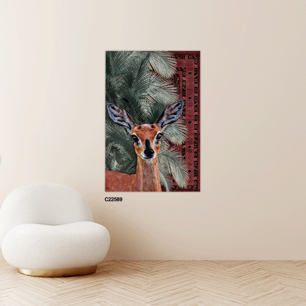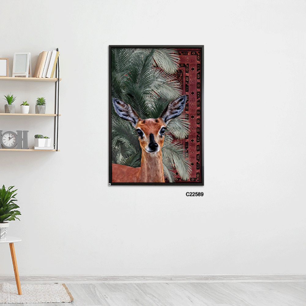 تُعرض هذه اللوحة الجدارية بتصميم فني مميز يجسد صورة غزال بخلفية من سعف النخيل ونقوش السجاد، مستخدمة تدرجات الألوان الأخضر والبني والأحمر والأزرق والرم...