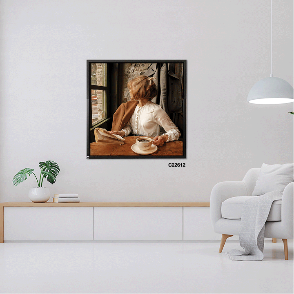 أضف لمسة من الدفء والراحة إلى ديكور منزلك مع هذه اللوحة الجدارية الكانفس التي تجسد فتاة تحمل كوباً من القهوة. تتداخل في هذا التصميم تدرجات البني، البي...