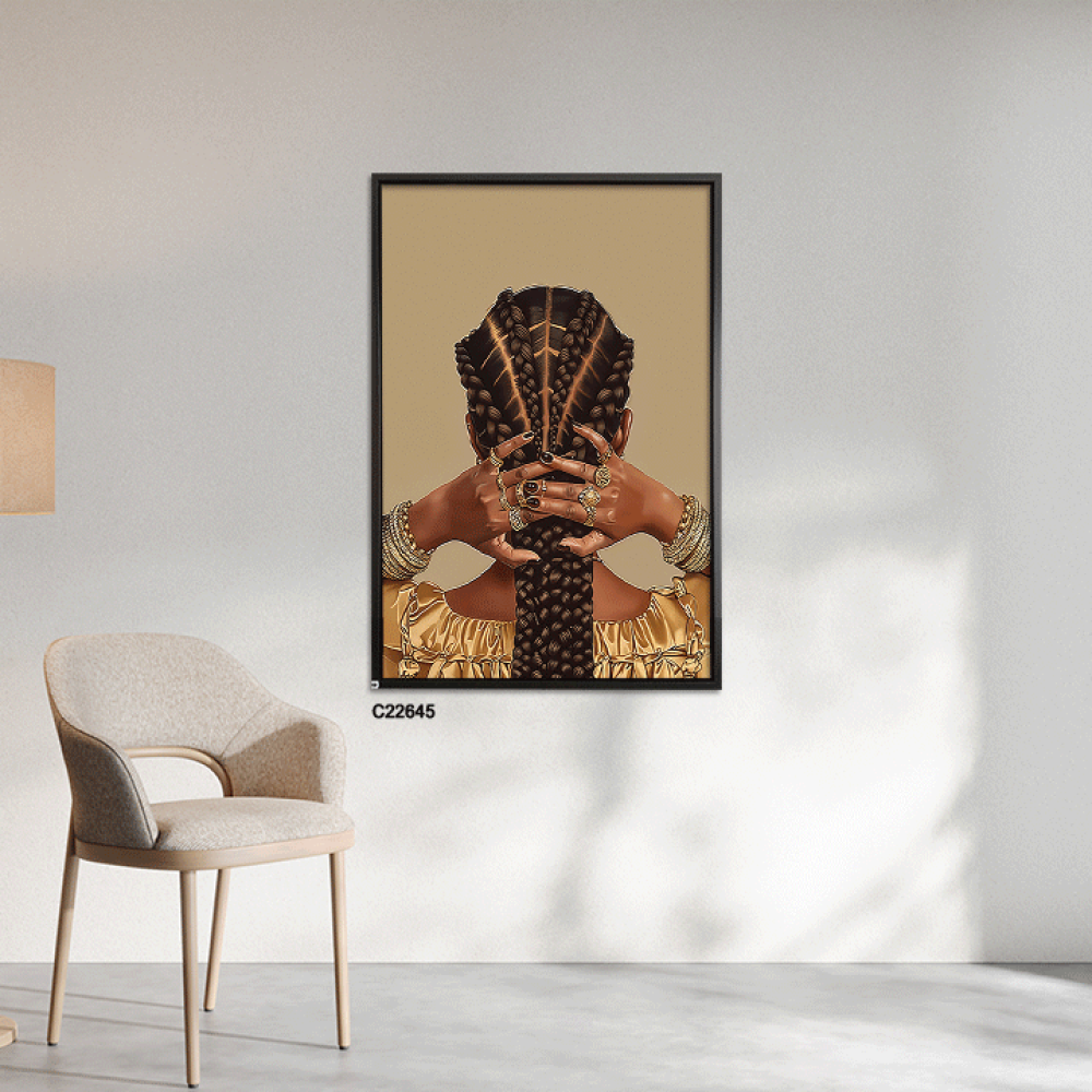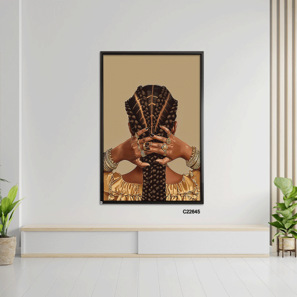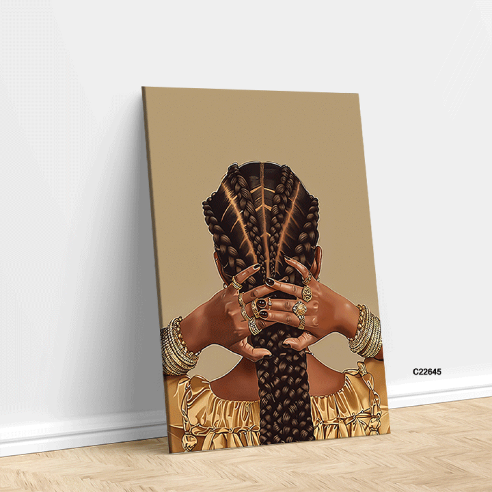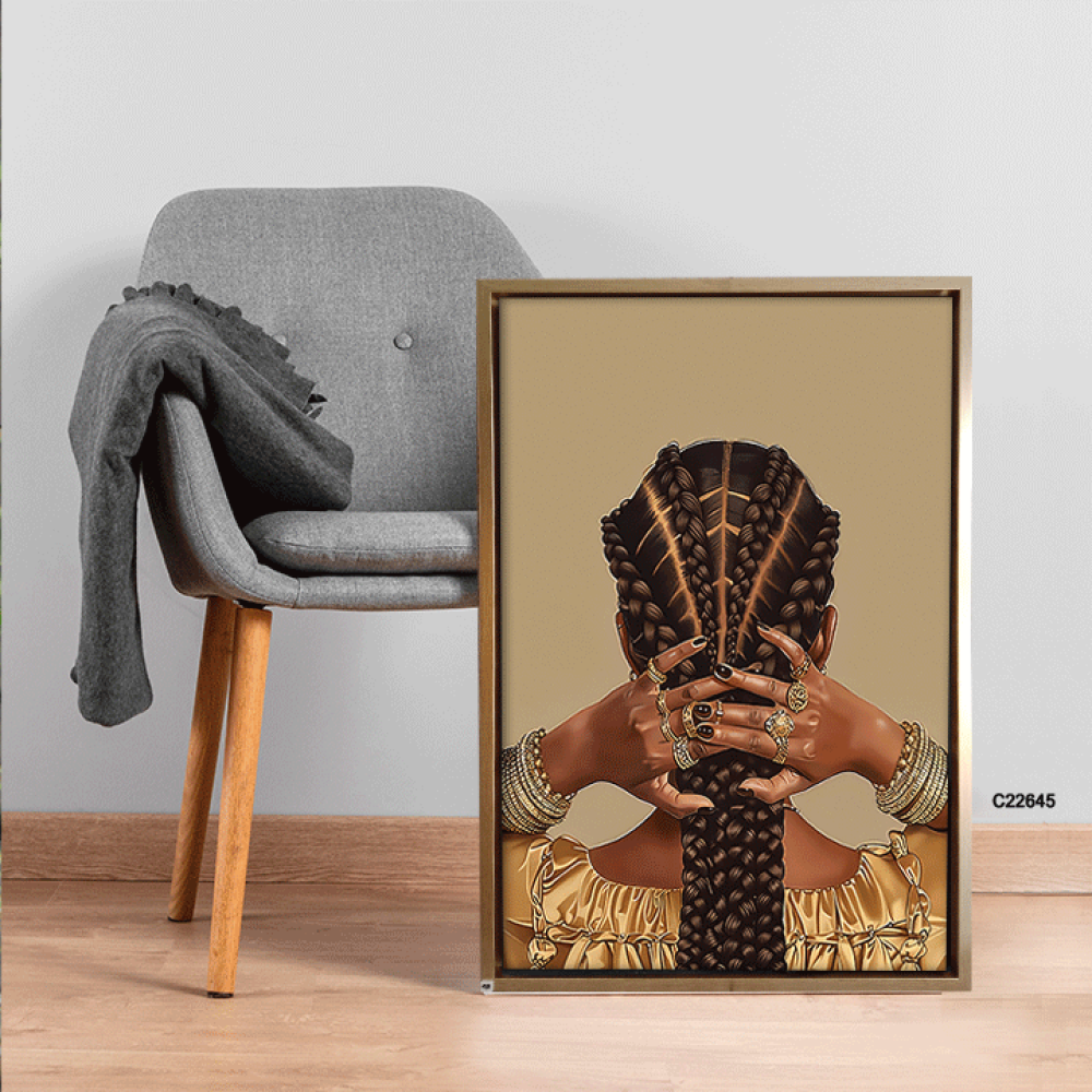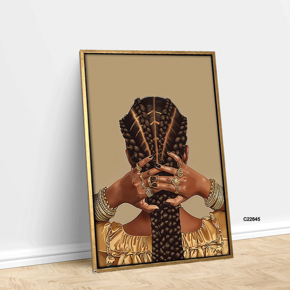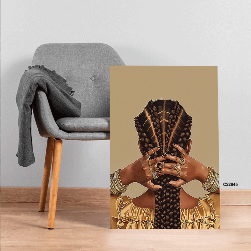 احتفظ بجمال وأناقة كل زاوية في منزلك أو مكتبك مع لوحة ضفائر شعر فتاة فريقية وحلي باللون الذهبي من متجر فيم ستور التي تجمع بين الجمال التقليدي والفخامة المعاصرة.