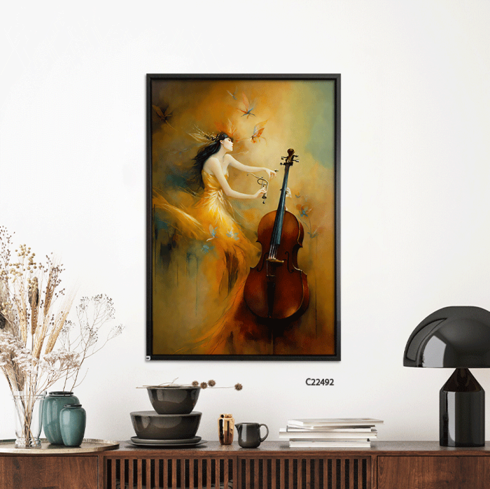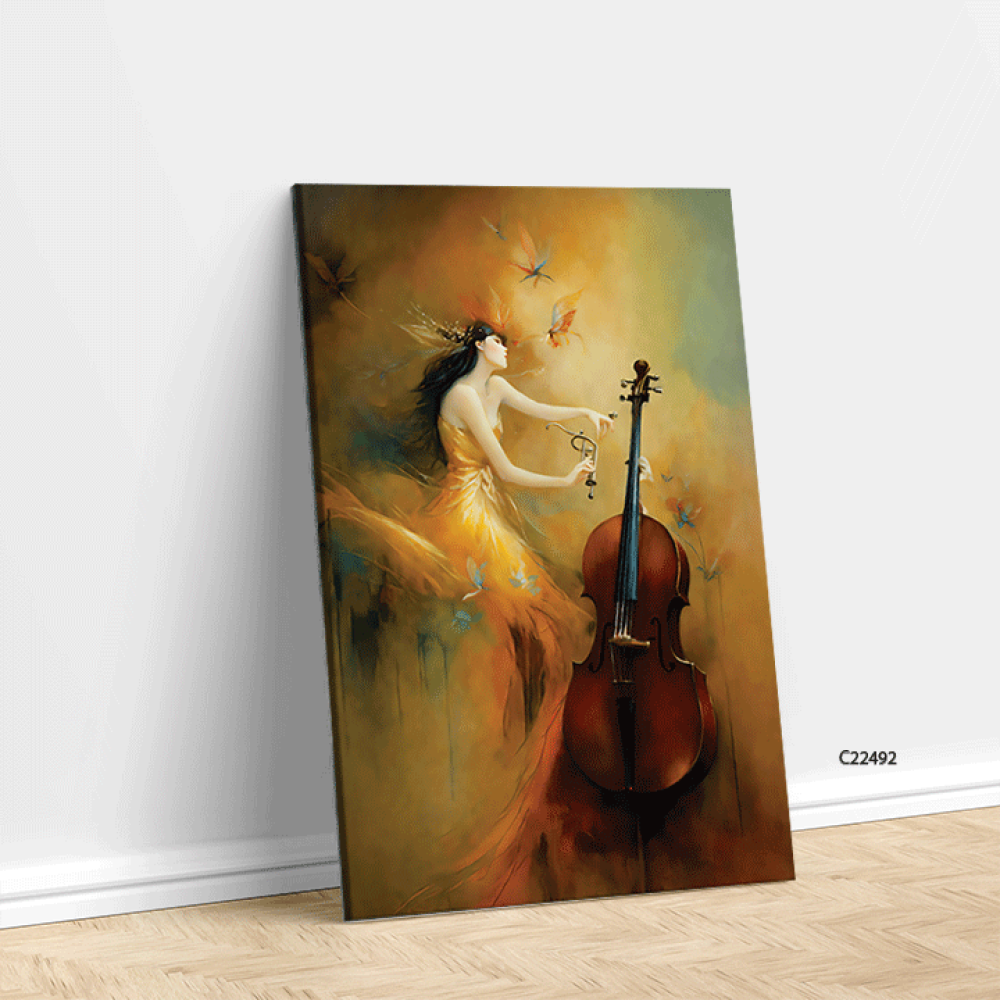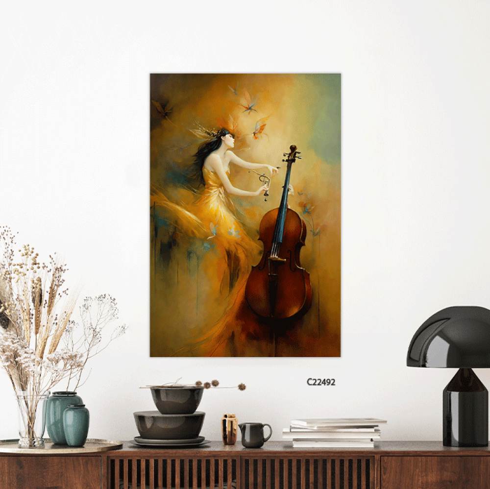 أضف لمسة من الأناقة والفخامة لديكورك مع لوحة فنية جدارية كانفس تصور فتاة تعزف على التشيللو بألوان دافئة. يجسد التصميم حيوية الألوان الدافئة مثل البرتق...