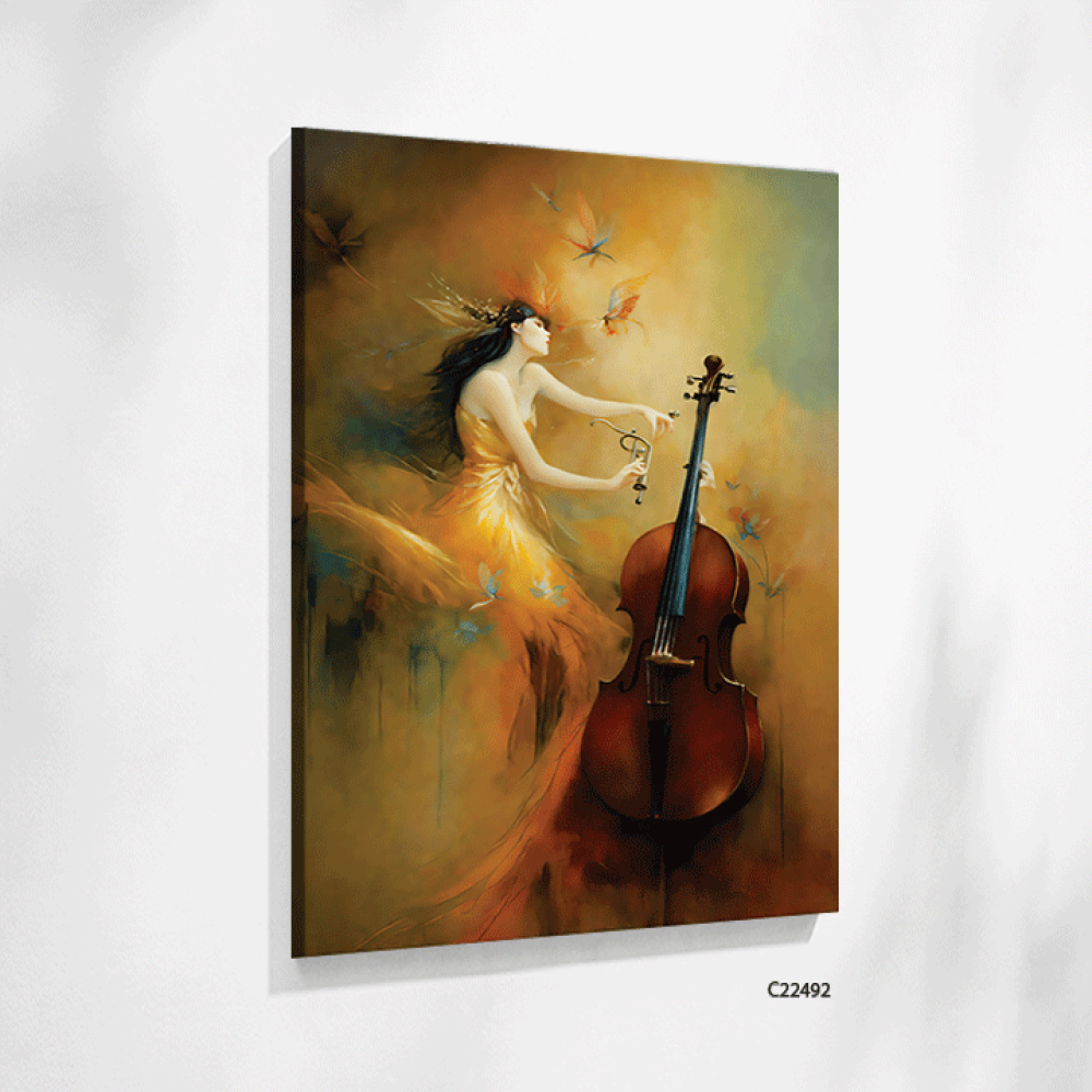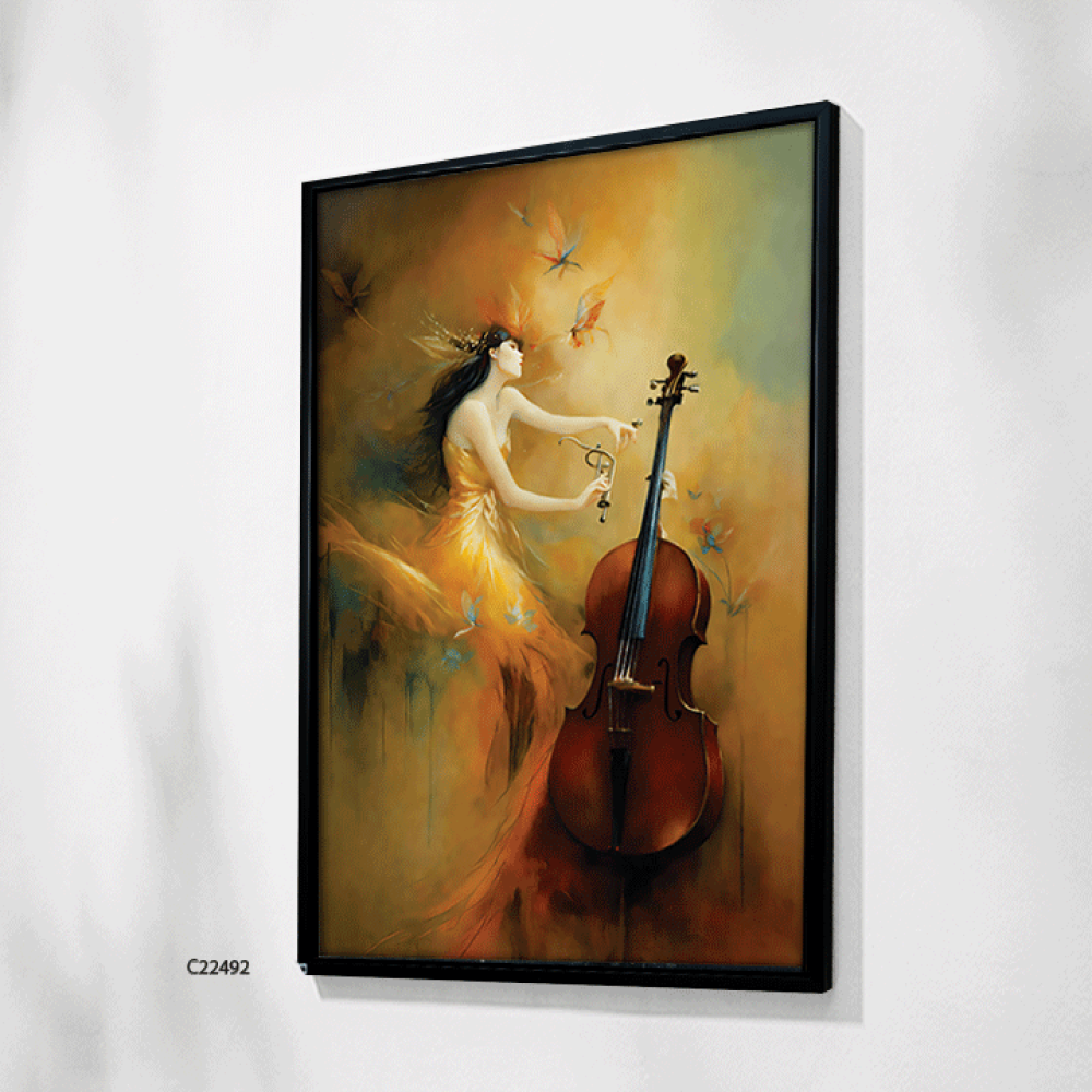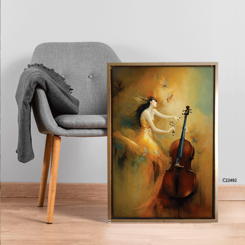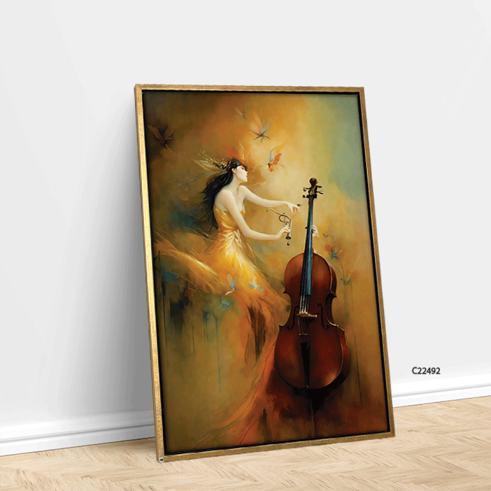 أضف لمسة من الأناقة والفخامة لديكورك مع لوحة فنية جدارية كانفس تصور فتاة تعزف على التشيللو بألوان دافئة. يجسد التصميم حيوية الألوان الدافئة مثل البرتق...