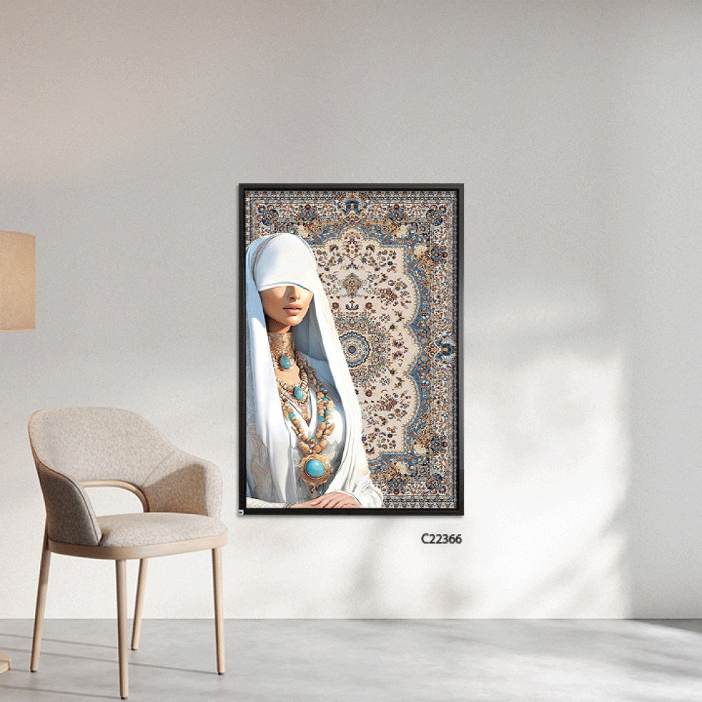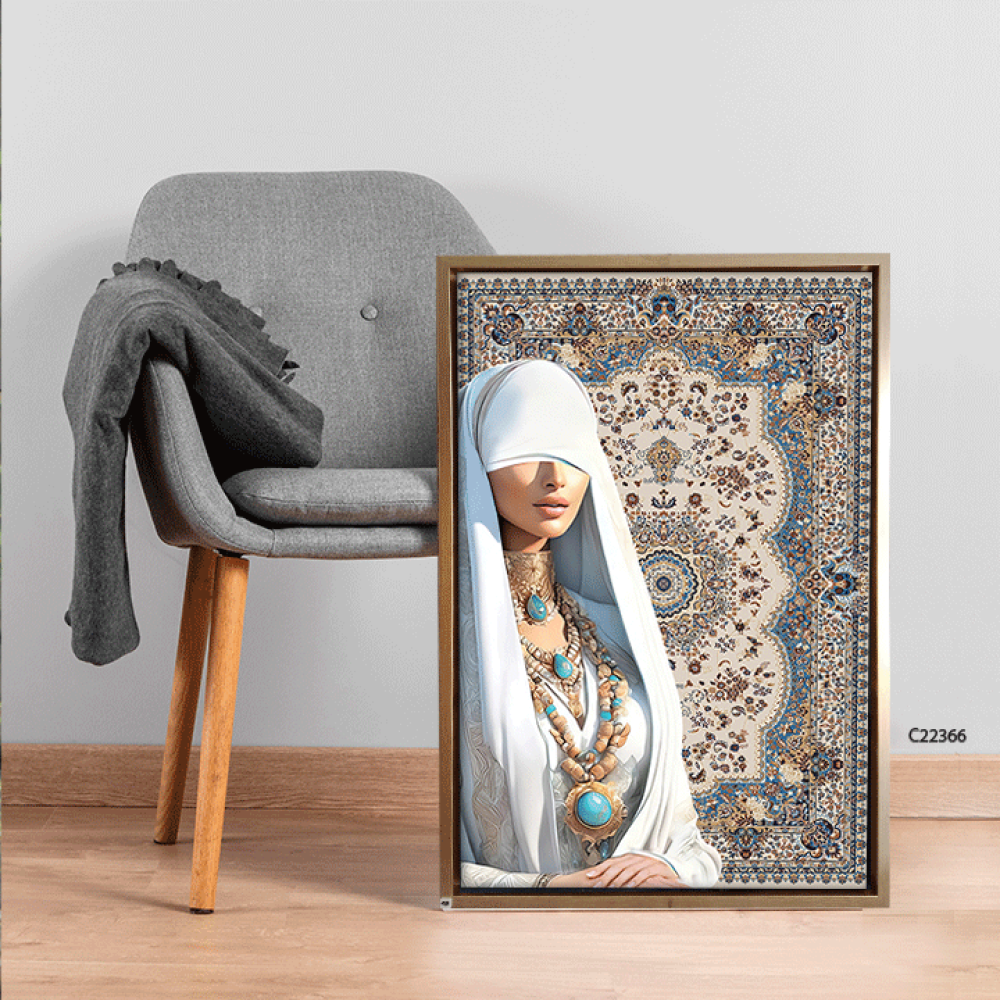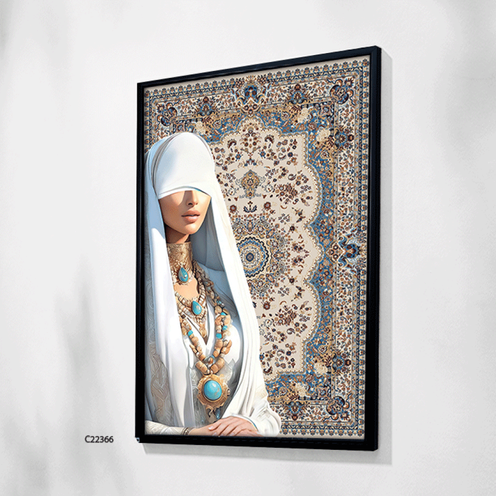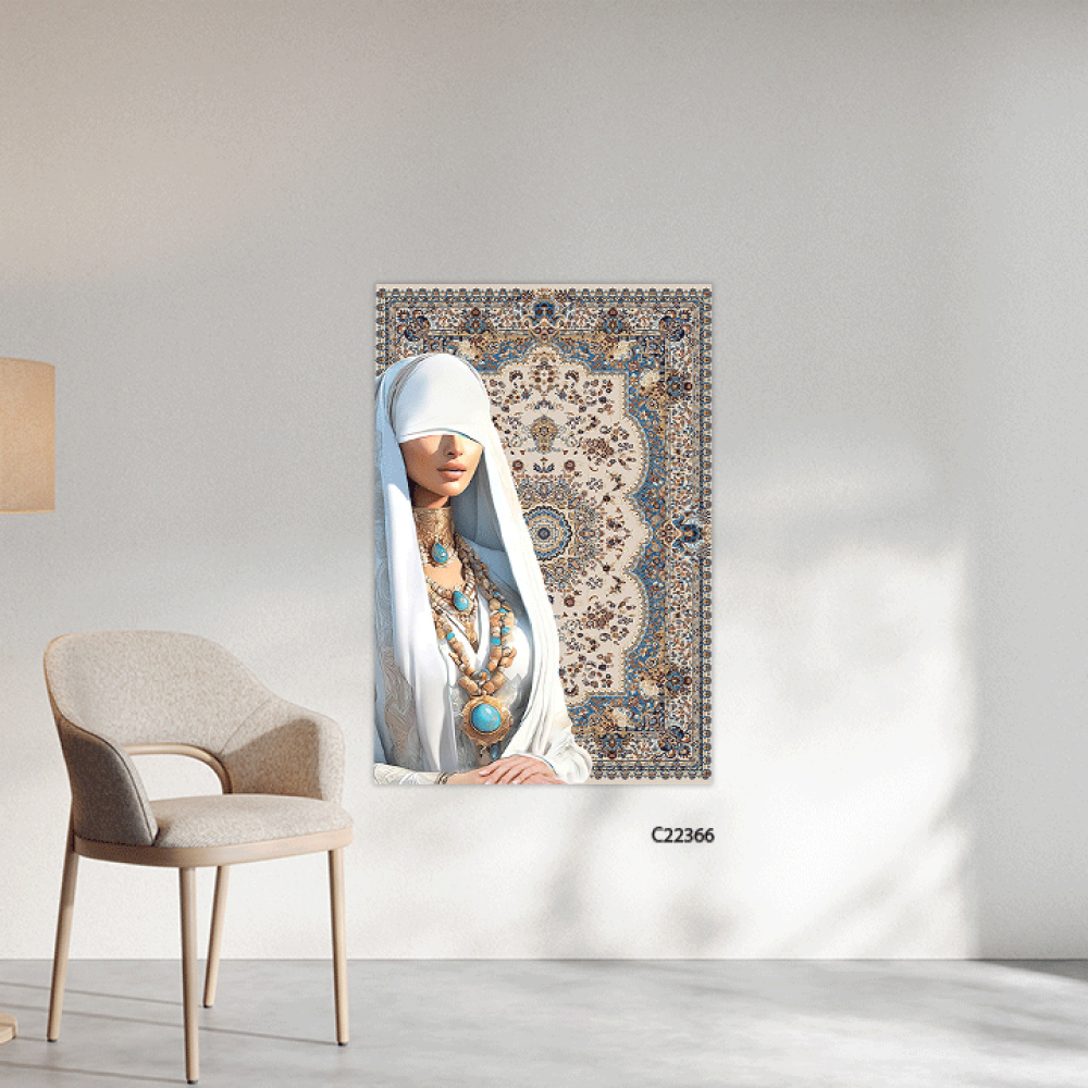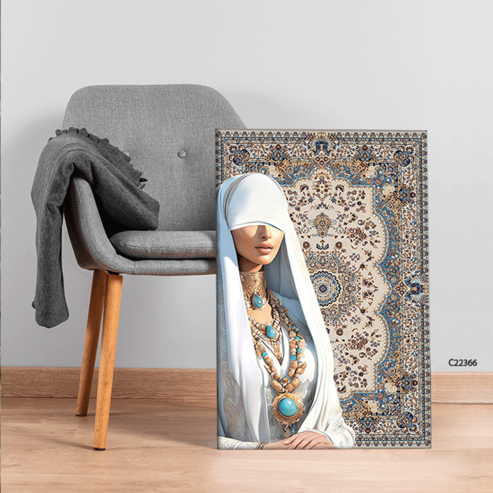 تأتي هذه اللوحة بتصميم ساحر يصور فتاة عربية بخلفية نقوش سجاد بتدرجات الأزرق والأبيض والبيج، ما يضفي جمالاً وإحساسًا بالانتعاش على أي مكان توضع فيه. ست...