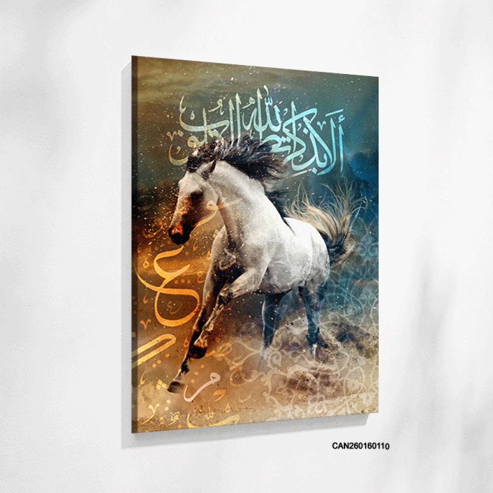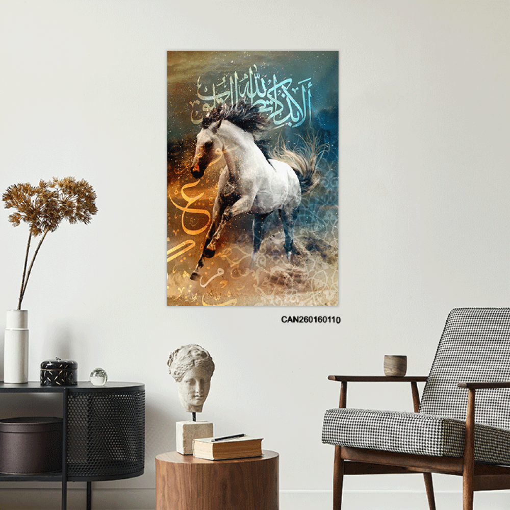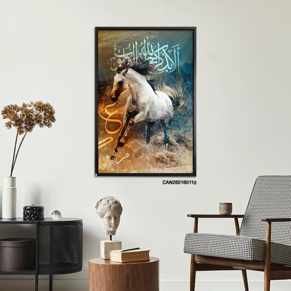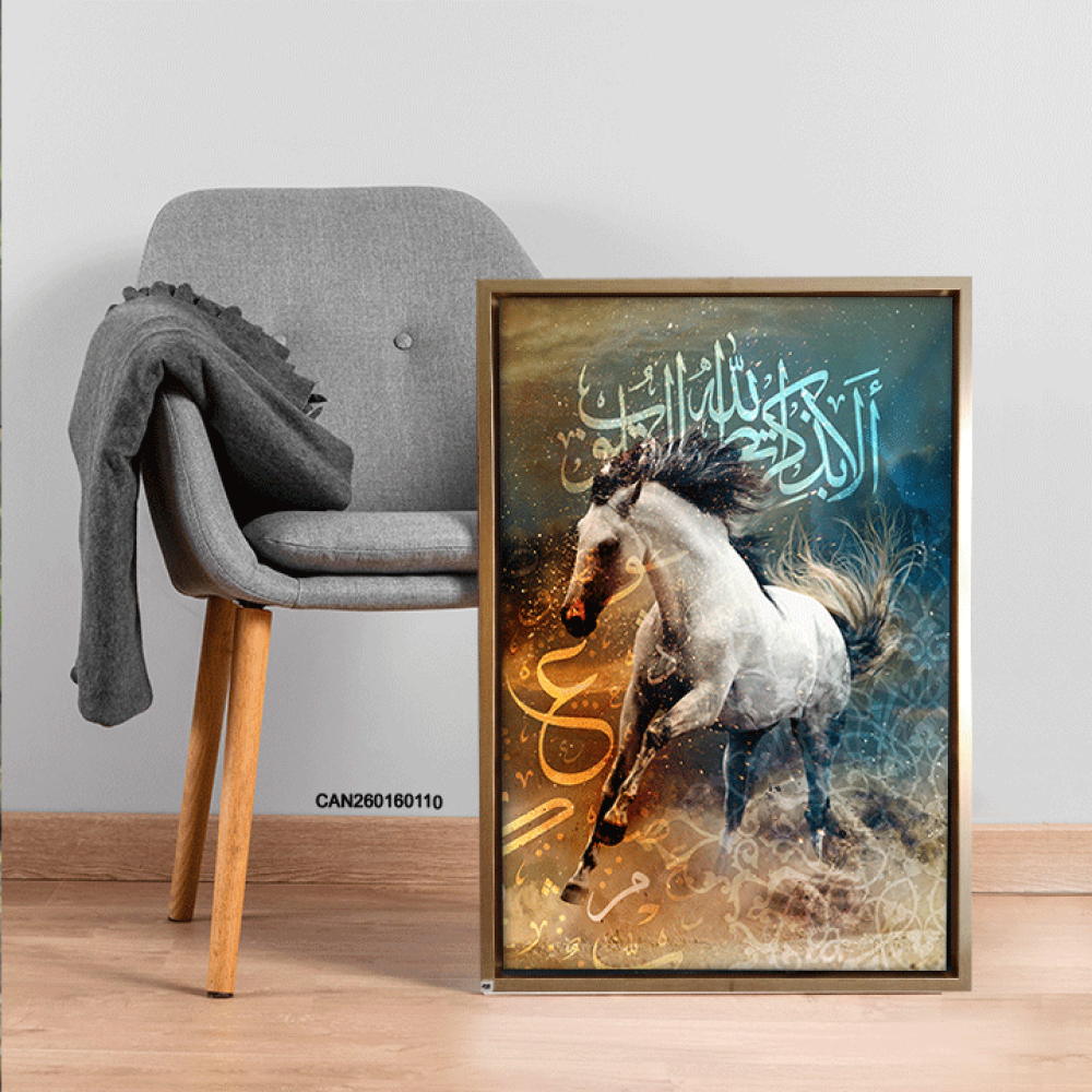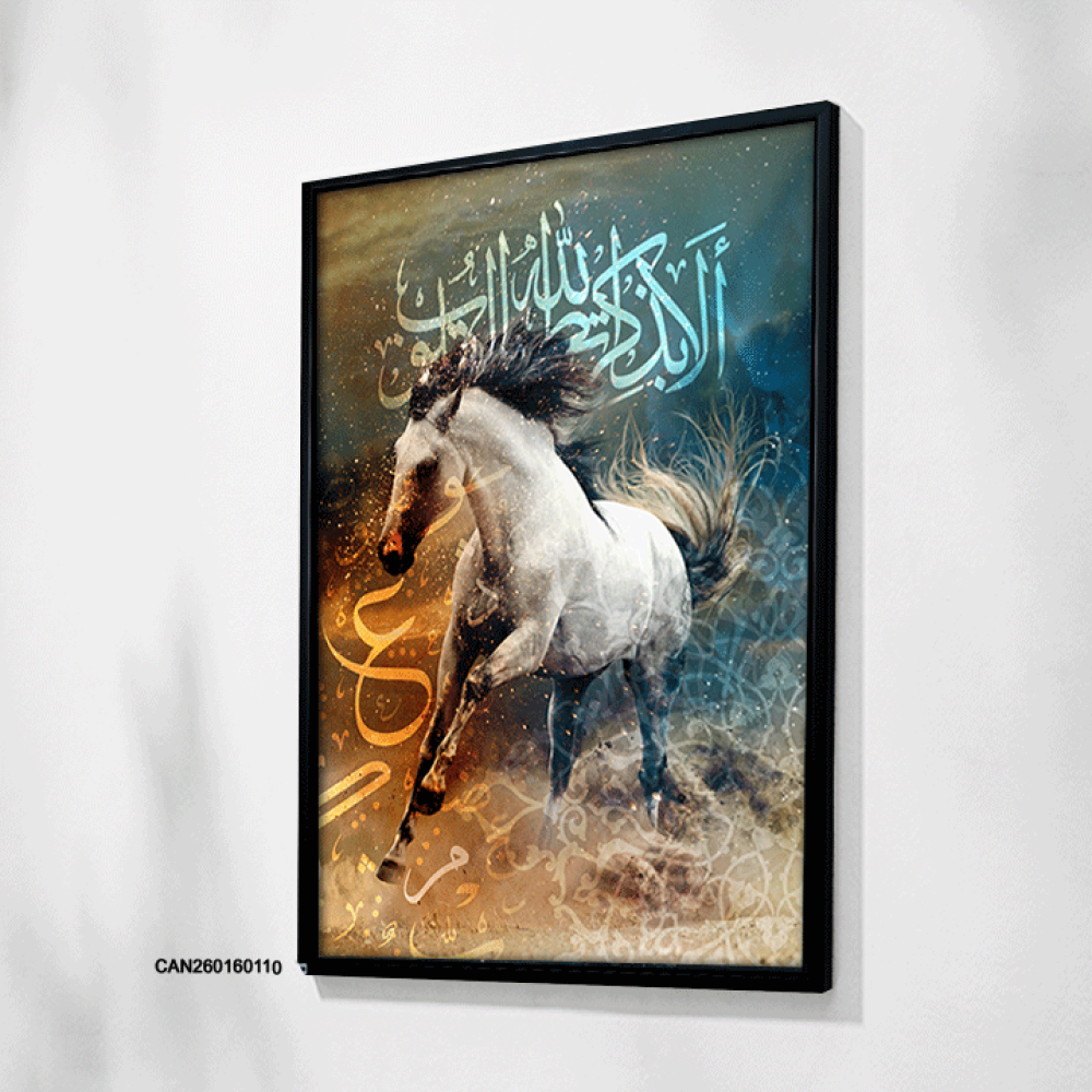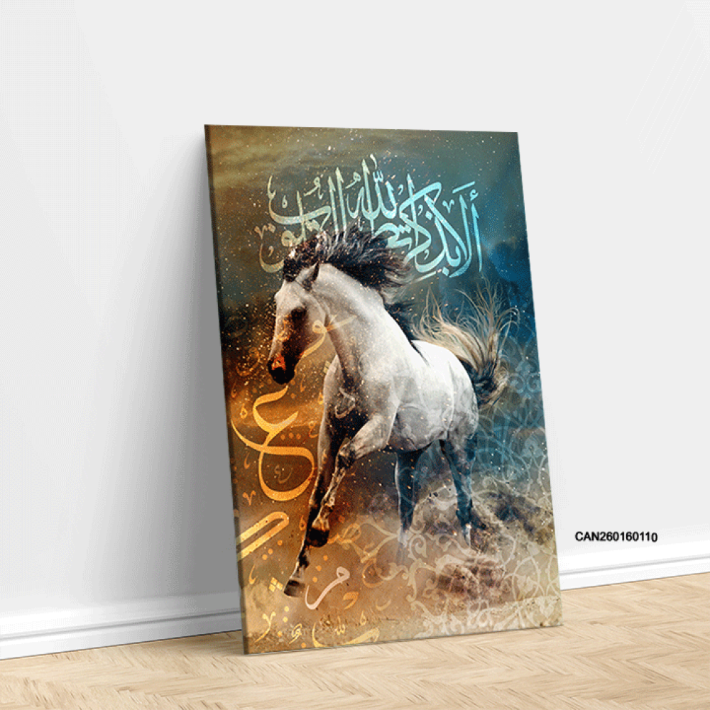 لوحة فنية جدارية كانفس خيل مع خط عربي (الا بذكر الله تطمئن القلوب)