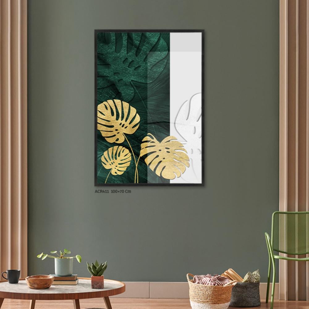 لوحة جدارية فنية من الأكريليك بتصميم يجسد أوراق الشجر بتدرجات مميزة من الأخضر، الذهبي، والأبيض. تمتاز اللوحة بجاذبية التصميم الذي يمزج بين الأسلوب الو...