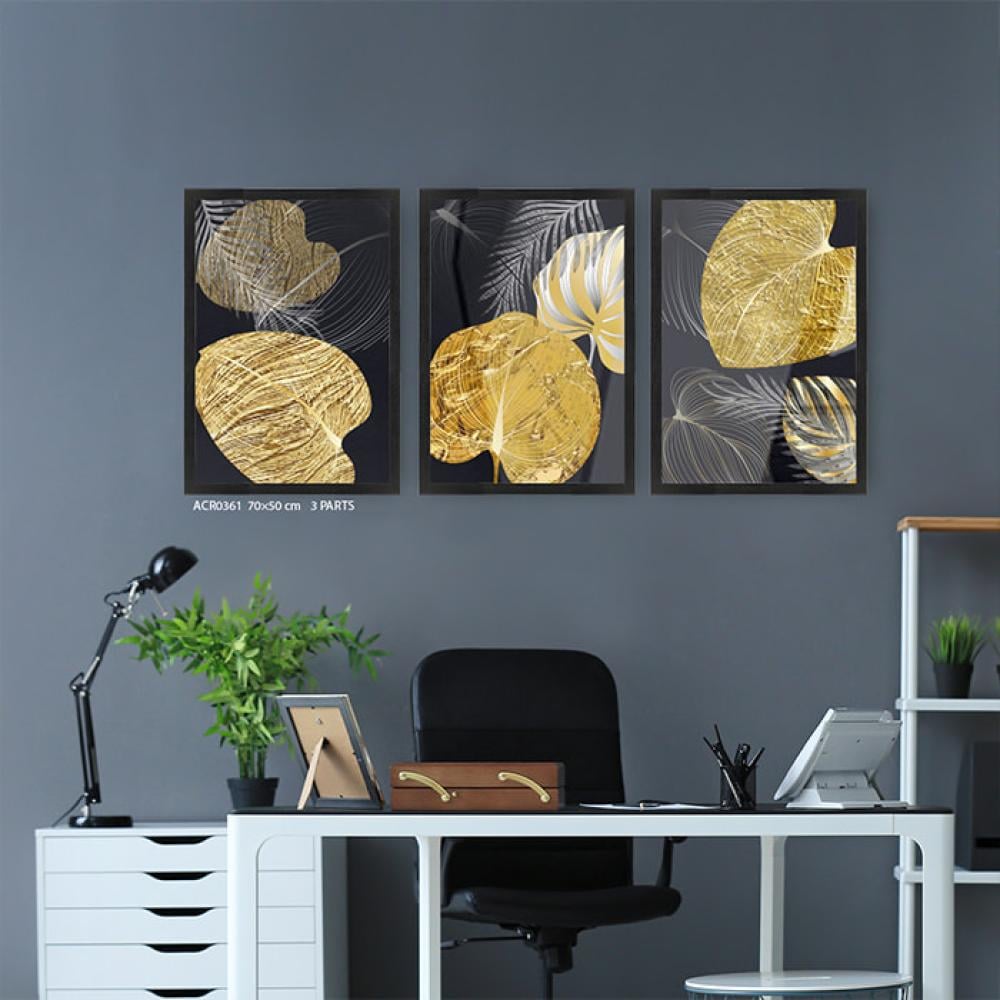 لوحة فنية جدارية رائعة بتصميم يعرض أوراق الشجر بتدرجات الألوان الذهبية والسوداء والبيضاء، حيث يمزج بين الألوان بأسلوب فني لخلق تأثير بصري جذاب يلفت ال...
