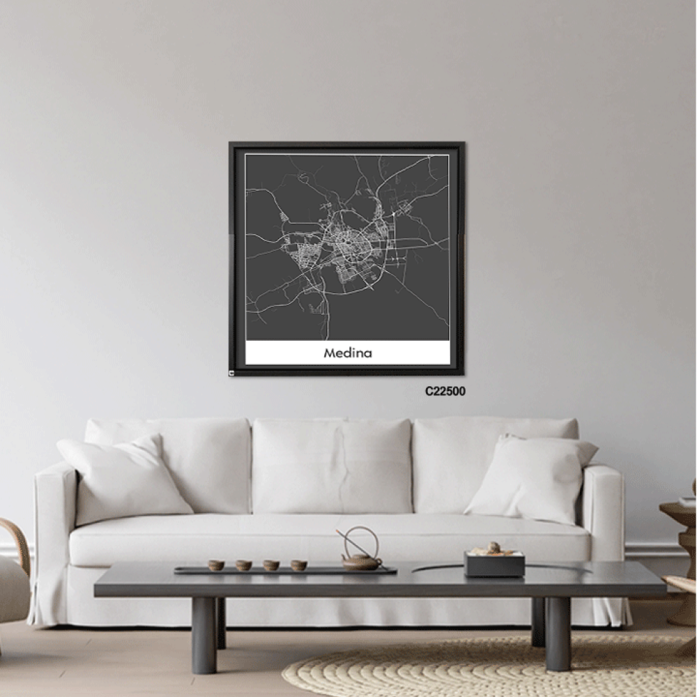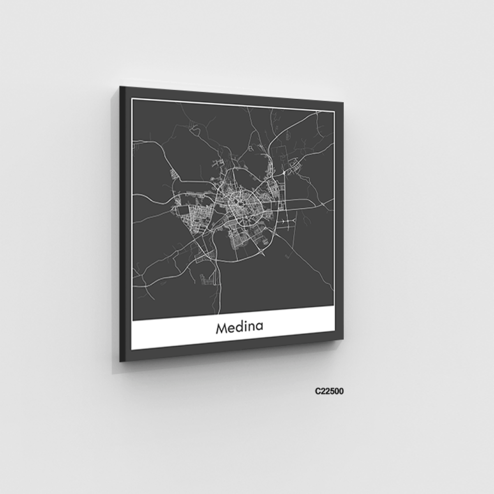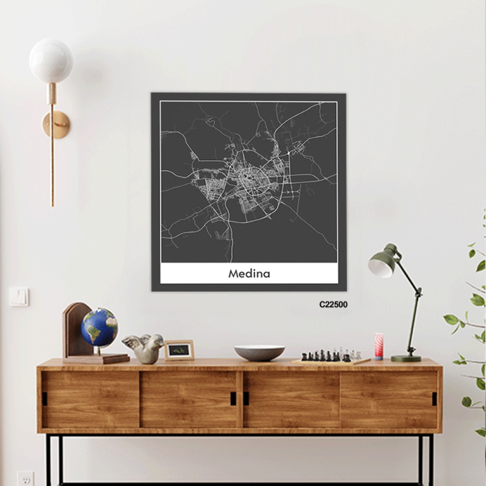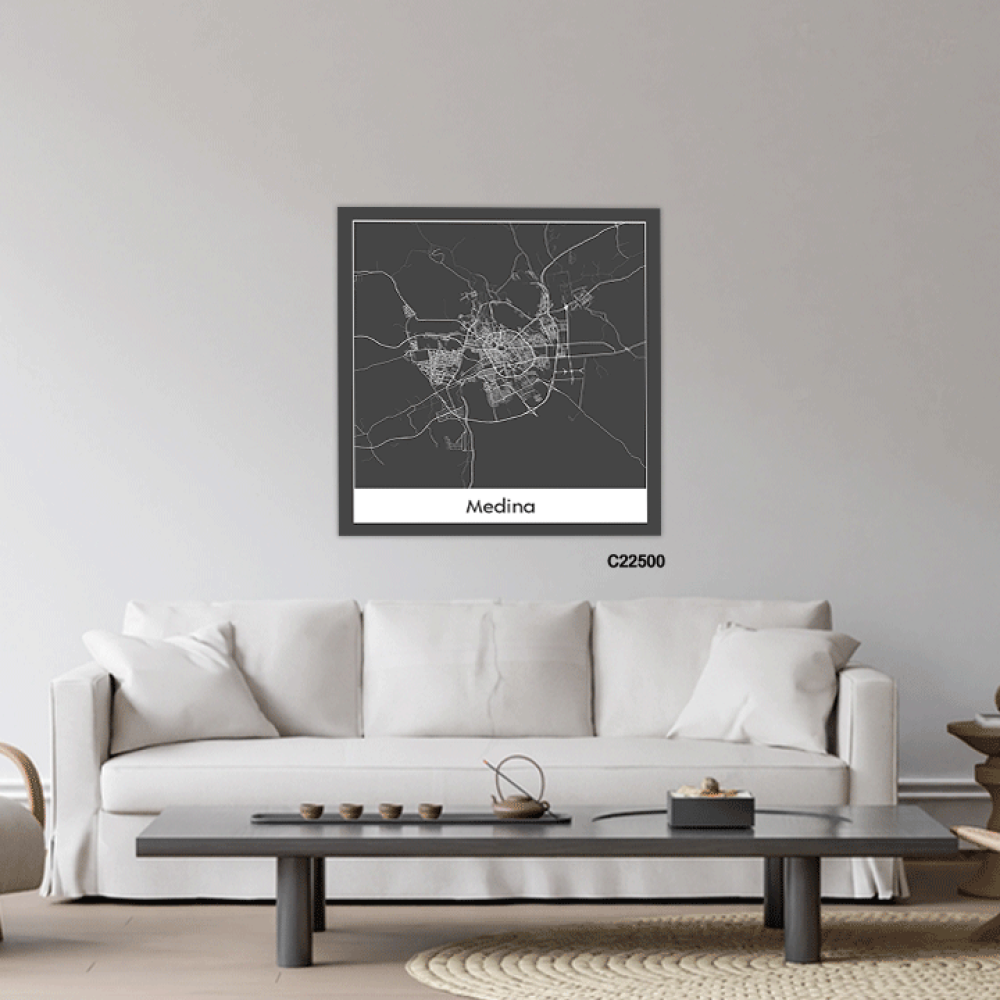 لوحة جدارية كانفس تحتوي على خريطة للمدينة المنورة بالأبيض والأسود