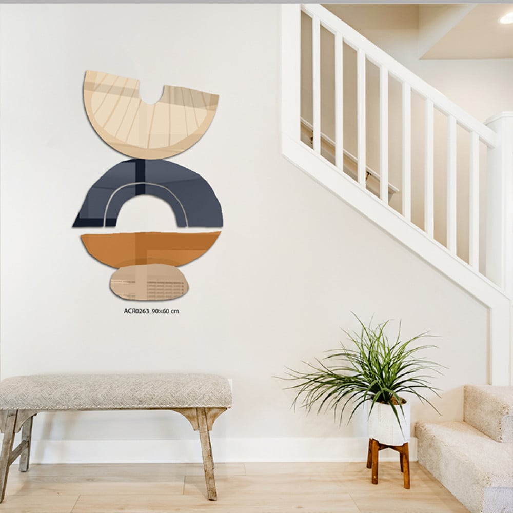 لوحة جدارية أكريليك بتصميم يشمل أنصاف دوائر متعاكسة بالألوان البني والكحلي مع البيج. يتميز هذا التصميم بتناغم فريد بين الألوان الداكنة والفاتحة، مما ي...