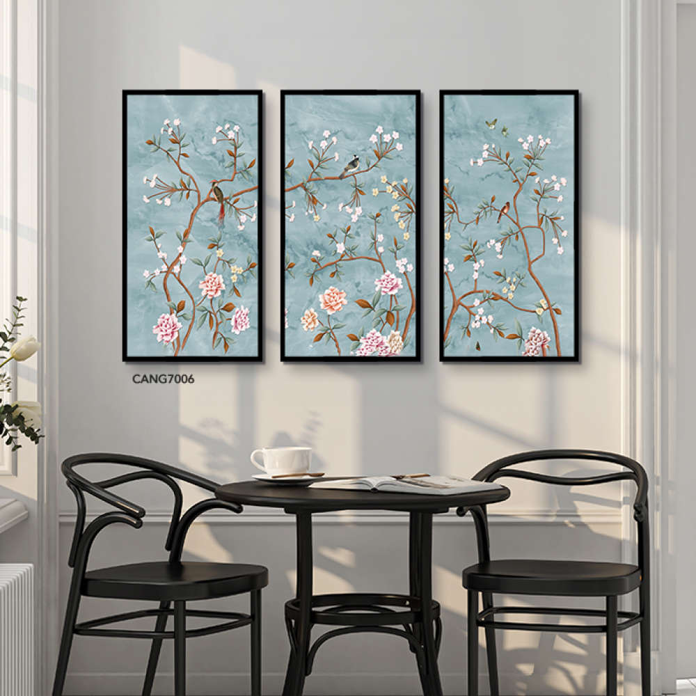 لوحة جدارية كانفس ورد وطيور وأغصان تدرجات وردي وازرق رمادي
