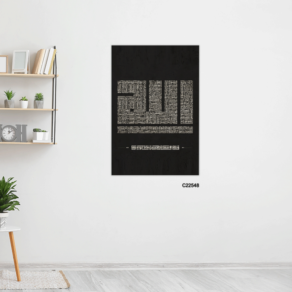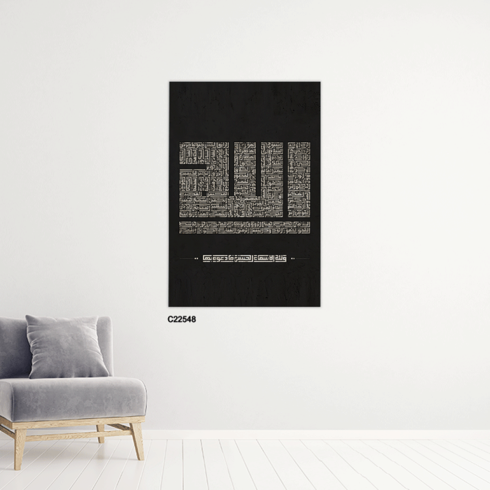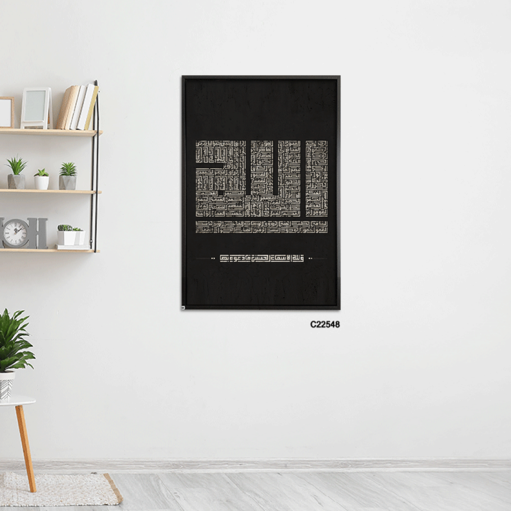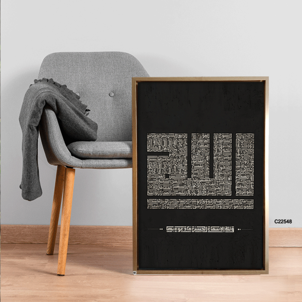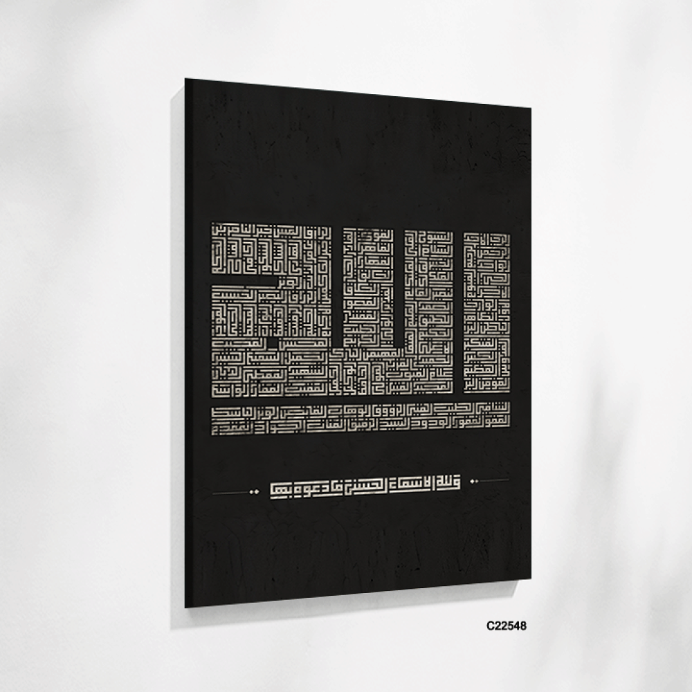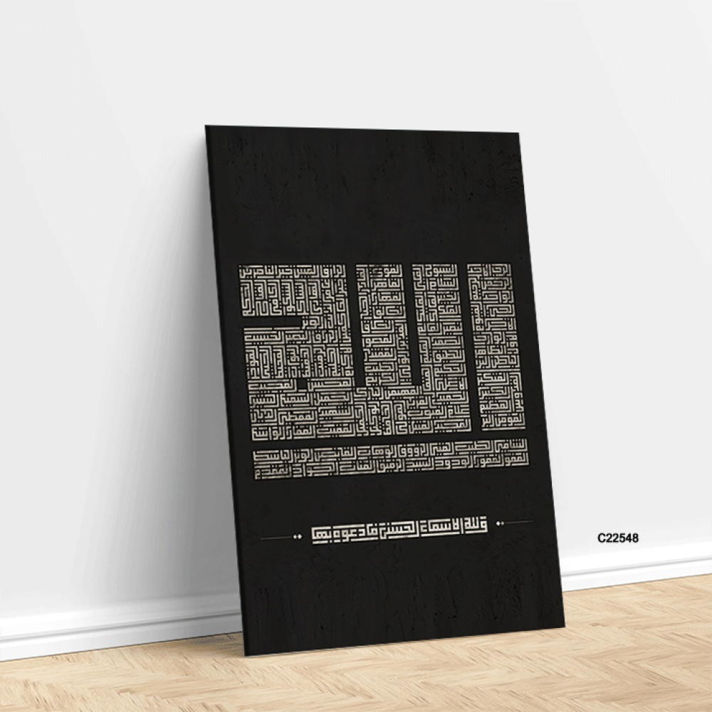 لوحة جدارية كانفس تحتوي على اسماء الله الحسنى بالخط الكوفي المربع بتدرجات البيج والاسود