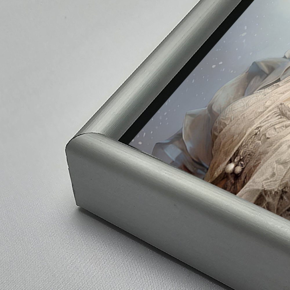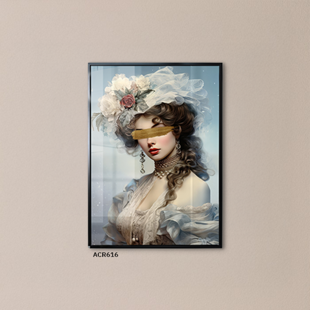 لوحة جدارية أكريليك تجسد سيدة من الحقبة الفكتورية بفستان دقيق التفاصيل مزخرف بتدرجات هادئة من الأبيض والأزرق الفاتح. تزين رأسها بقبعة مزينة بأزهار كبي...
