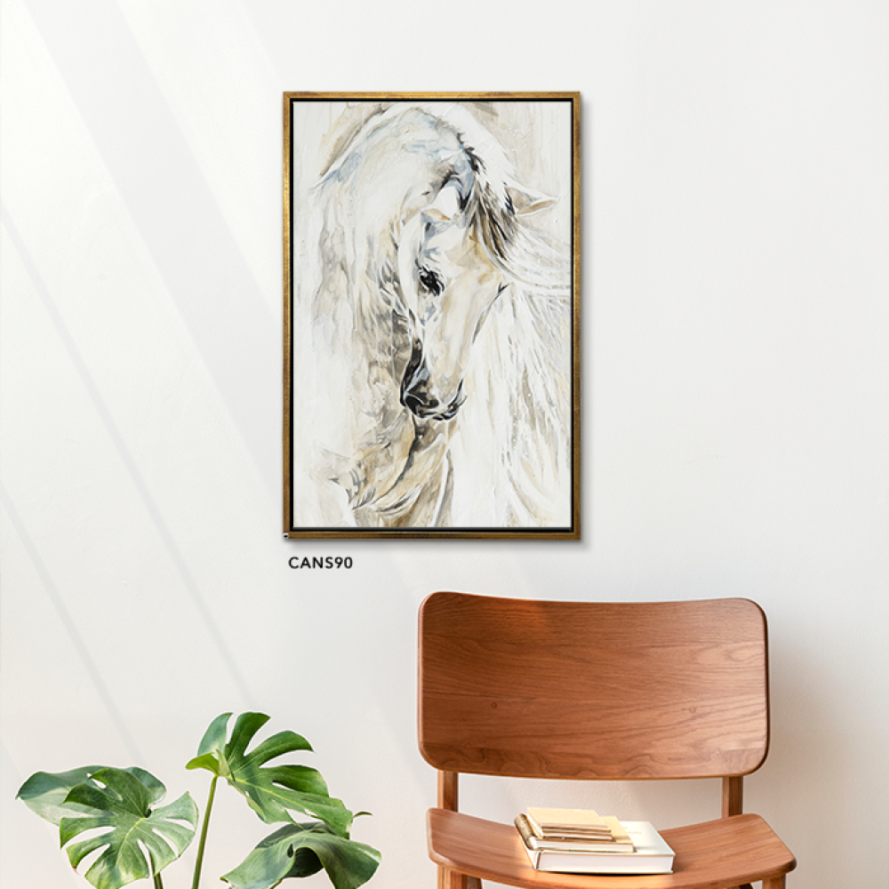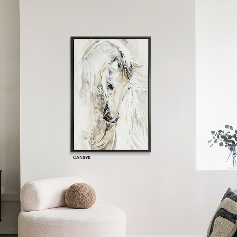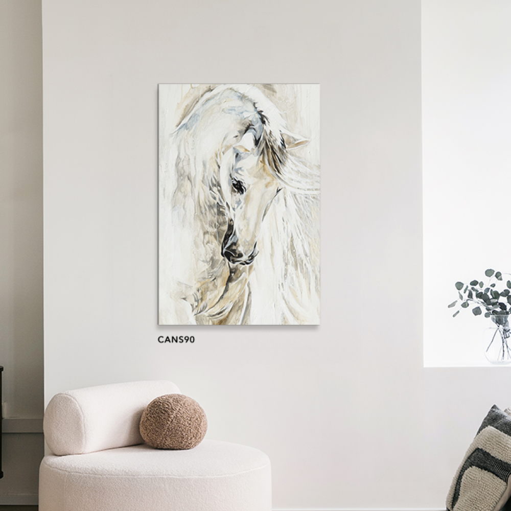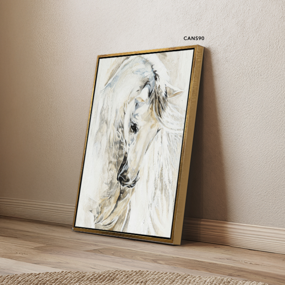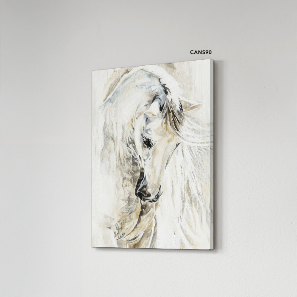 أضف لمسة من الأناقة والرقي إلى مساحتك مع لوحة خيل أبيض بتدرجات البيج، حيث يجتمع الفن مع القوة والجمال في تحفة فنية تنبض بالحياة. هذه اللوحة الجدارية ا...