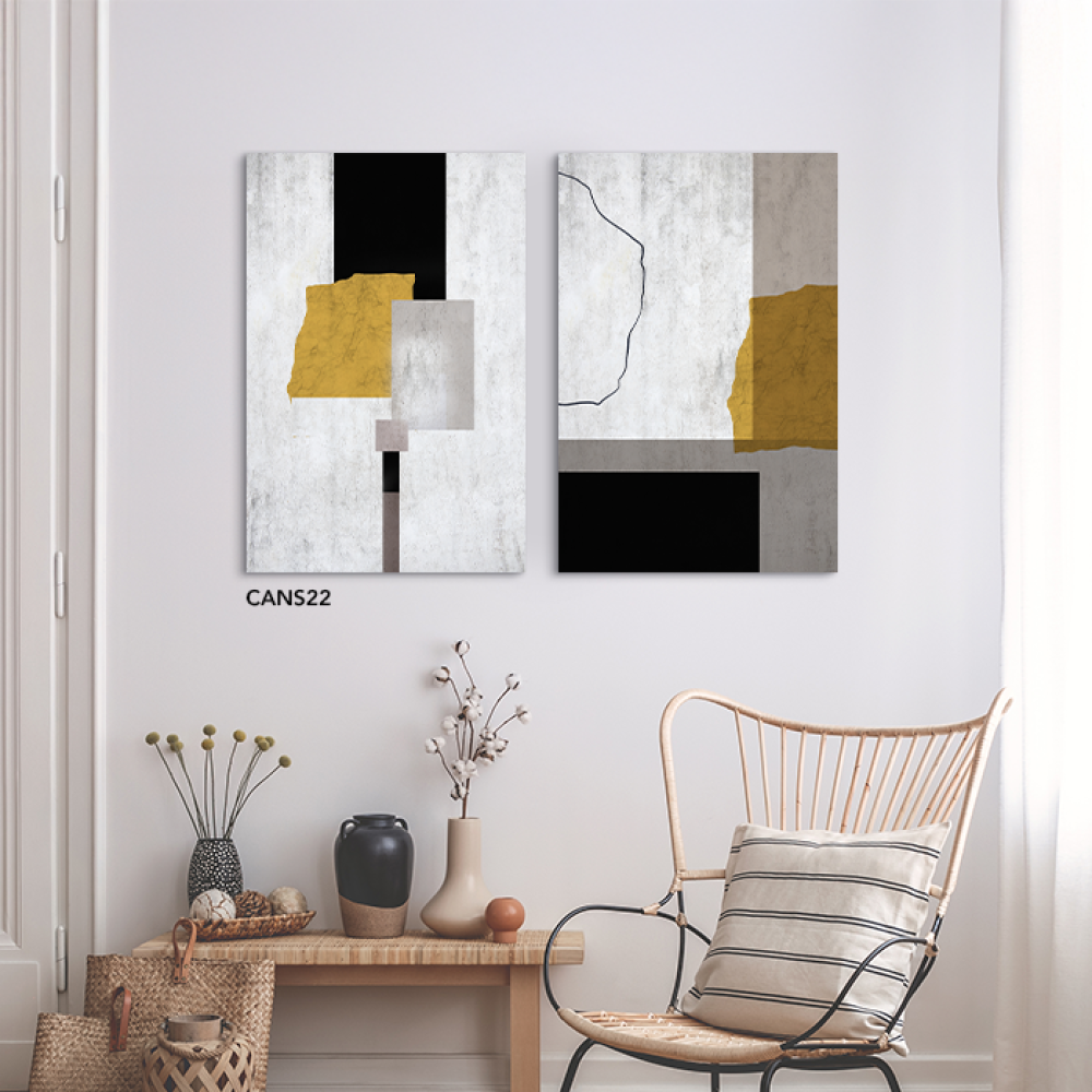 أضف لمسة من الإبداع والأناقة لديكورك مع لوحة جدارية كانفس !تأتي هذه اللوحة بتصميم من الفن التجريدي، يحمل أشكال ومربعات متداخلة بتدرجات الذهبي مع الأسو...