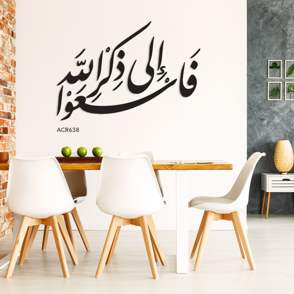 لوحة أكريليك فنية بتصميم خط عربي أنيق تحمل اية قرآنية ( فاسعوا الى ذكر الله) جسد جمال الخط العربي الكلاسيكي بانحناءاته وانسيابيته الفريدة.الخط المستخدم يتميز بأسلوبه الانسيابي، حيث تمتد الحروف لتشكل تكوينًا بصريًا مريحًا للعين . تناسب هذه اللوحة المجالس او غرف المعيشة- لوحة جدارية من الأكريليك مقصوصة بالليزر- كود المنتج : ACR638- سهلة وجاهزة للتركيب لوجود حامل خلفي ومسامير مرفقة.- للتعديل على الألوان أو المقاس يرجى التواصل واتس على 0556823009.