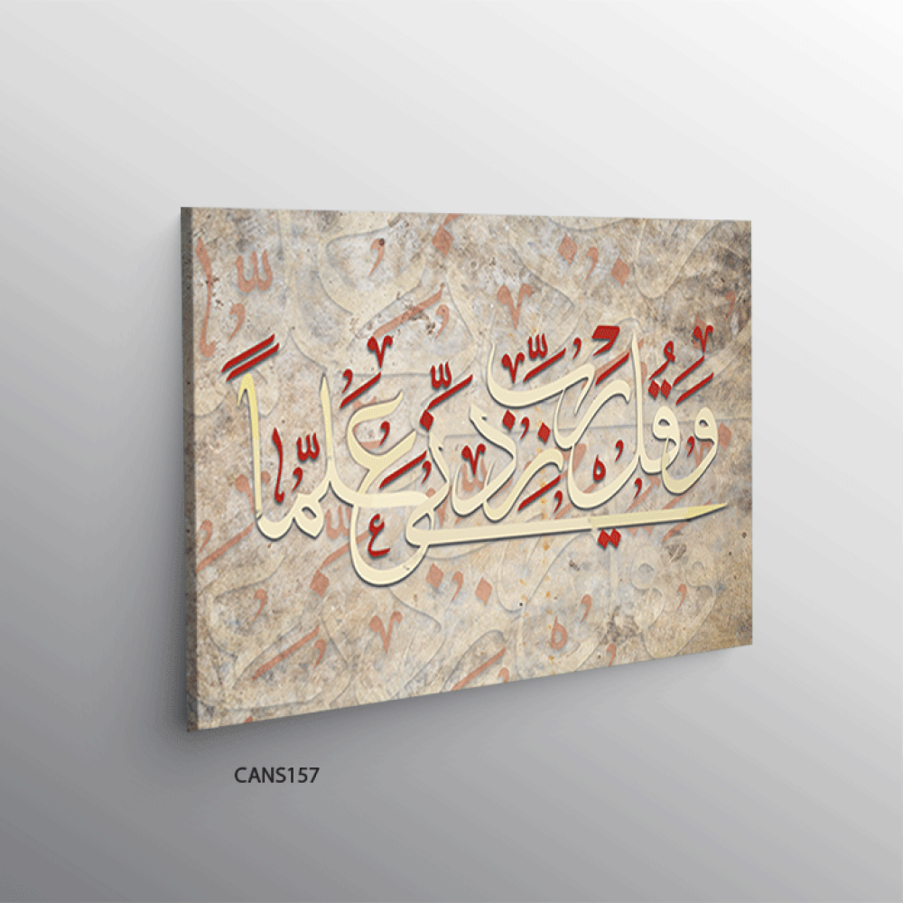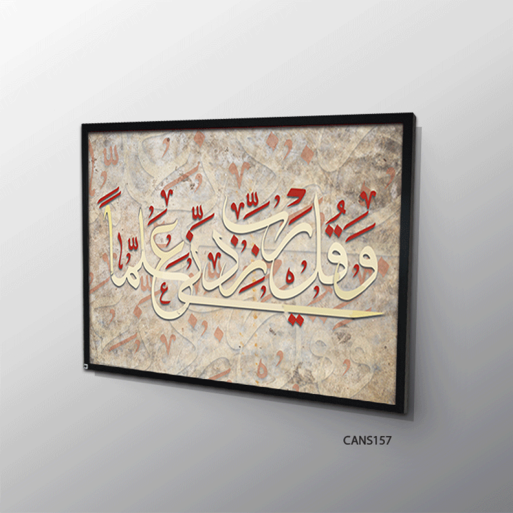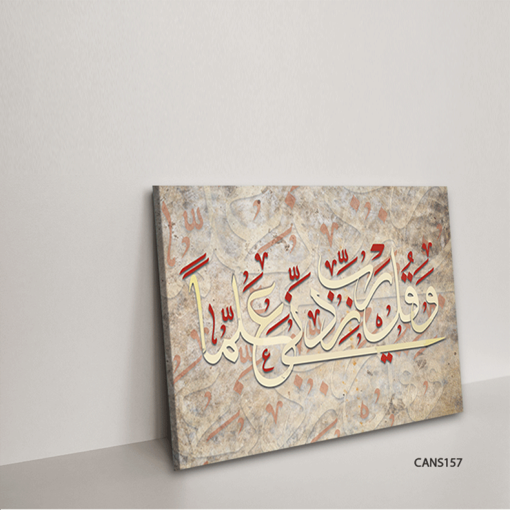 امنح ديكورك لمسة روحانية فريدة مع لوحة جدارية كانفس!تأتي بتصميم من الفن الإسلامي ، يحمل آية قرآنية بخط عربي (وقل ربي زدني علمًا) بتدرجات البيج مع الاح...