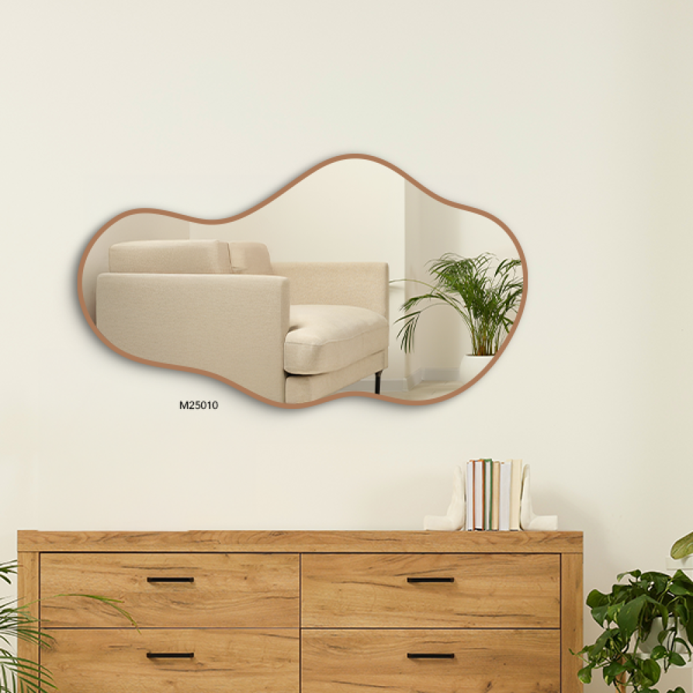مرايا كبيره للحائط ديكورية بتصميم عرضي غير تقليدي، بحواف منحنية وغير متناظرة تمنحها طابعًا فنيًا مميزًا.