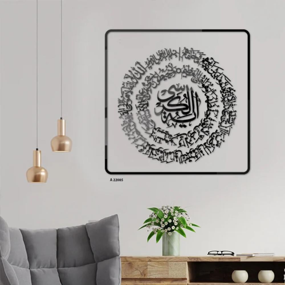 • تصميم فني فريد يتضمن آية الكرسي بخط عربي أنيق وتدرجات من اللون الأسود، مما يضفي طابعًا روحانيًا وجماليًا.