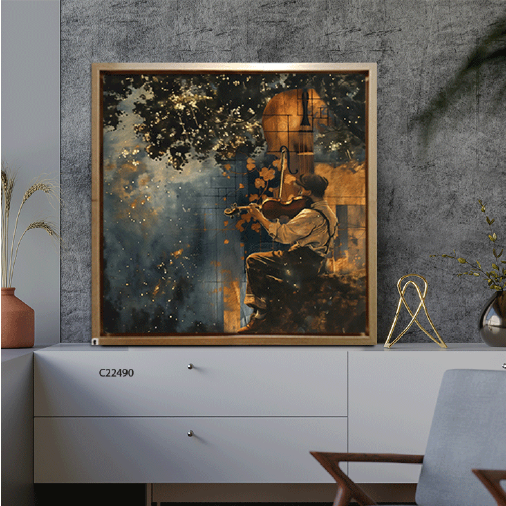 لوحة جدارية كانفس تصور عازف كمان بأسلوب كلاسيكي مع تدرجات من اللون البني والرمادي
