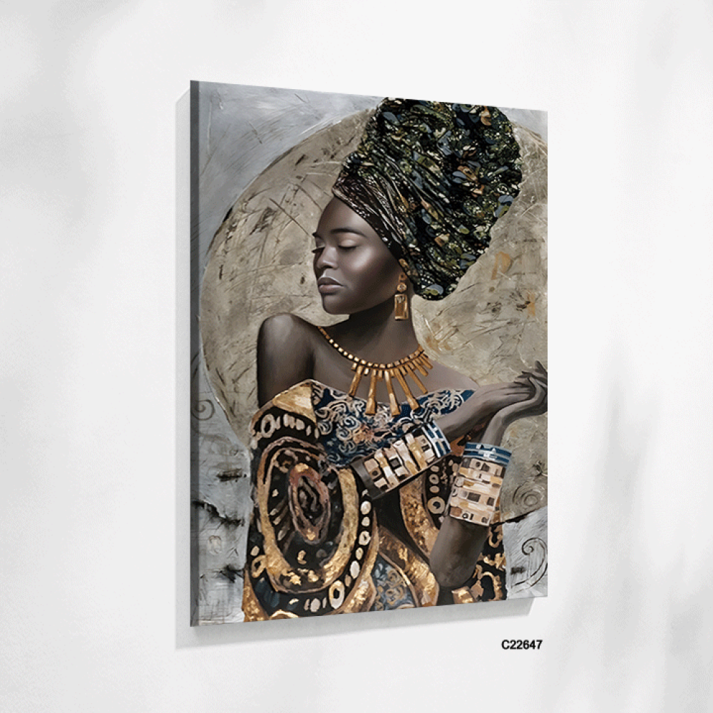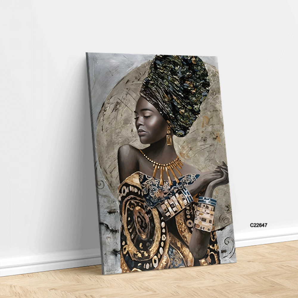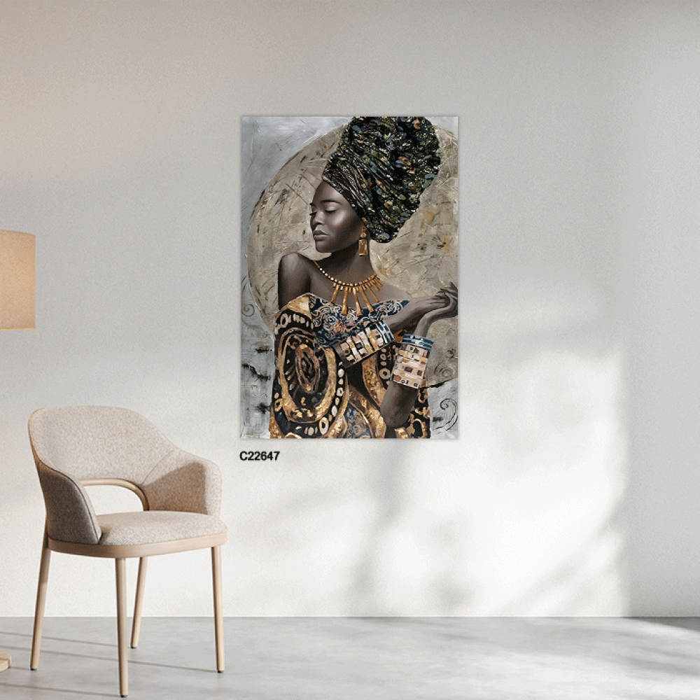 أضف لمسة من الفخامة والتفرد إلى منزلك مع هذه اللوحة الفنية الجدارية التي تصور امرأة إفريقية بملامح جميلة، ترتدي غطاء رأس فاخر مزين بألوان داكنة، متداخ...