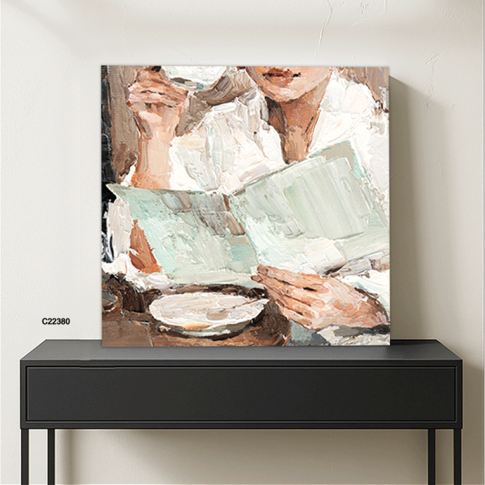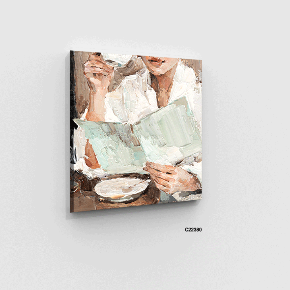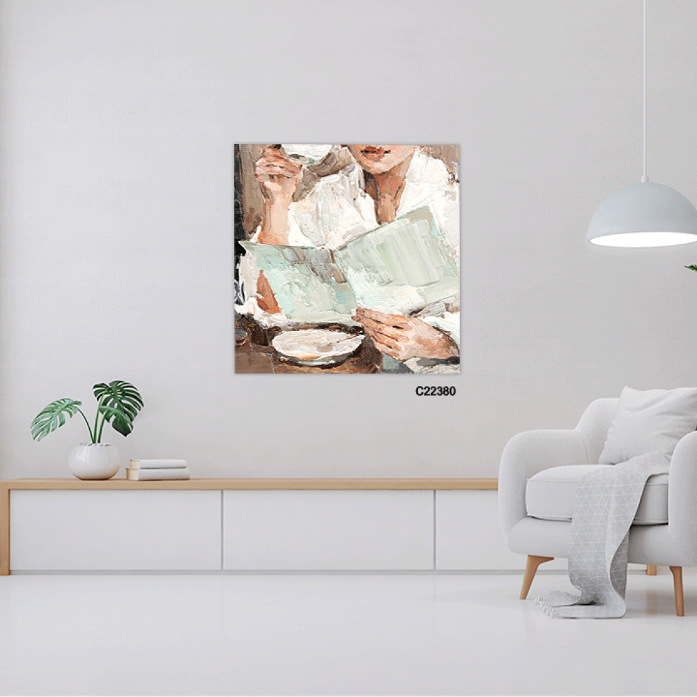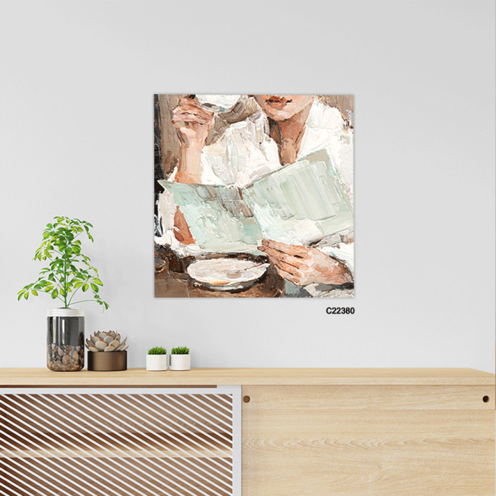 لوحة جدارية كانفس ،فتاة تقرأ وفنجان قهوة تدرجات الابيض والبني والبيج