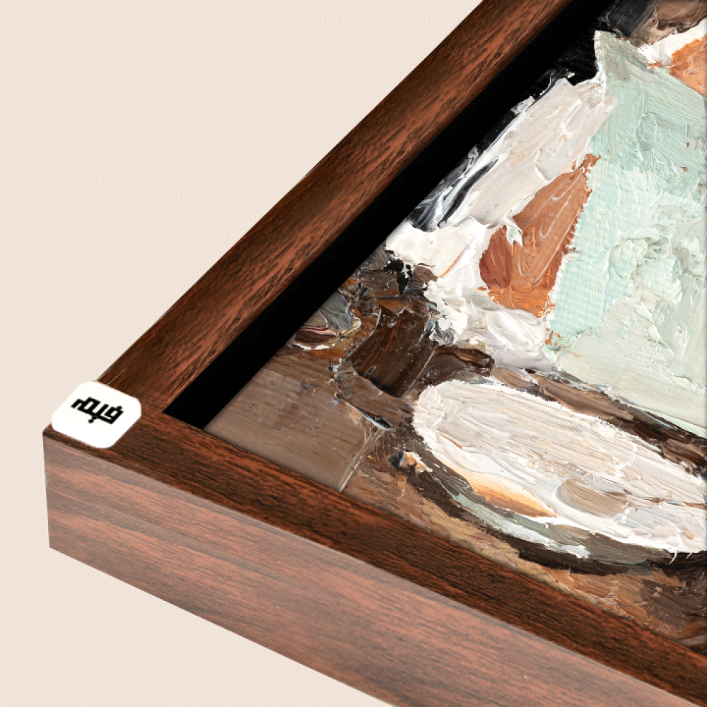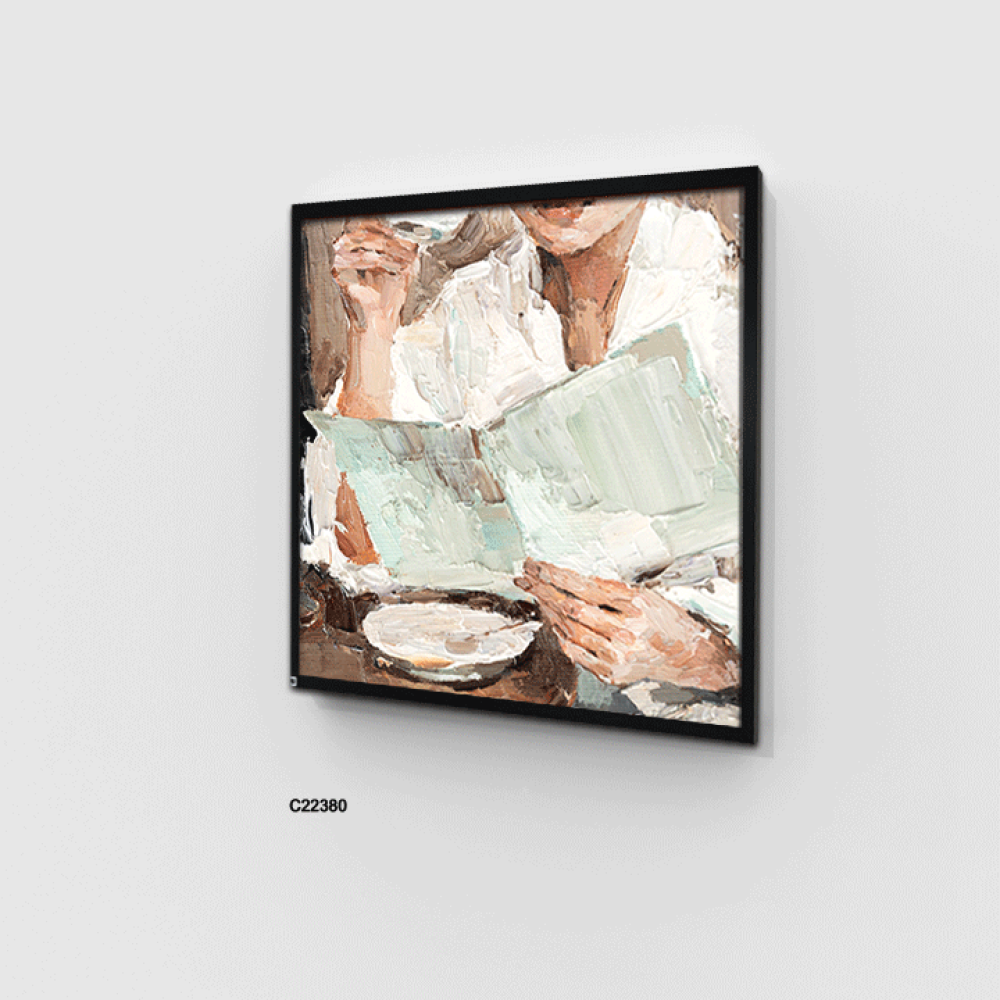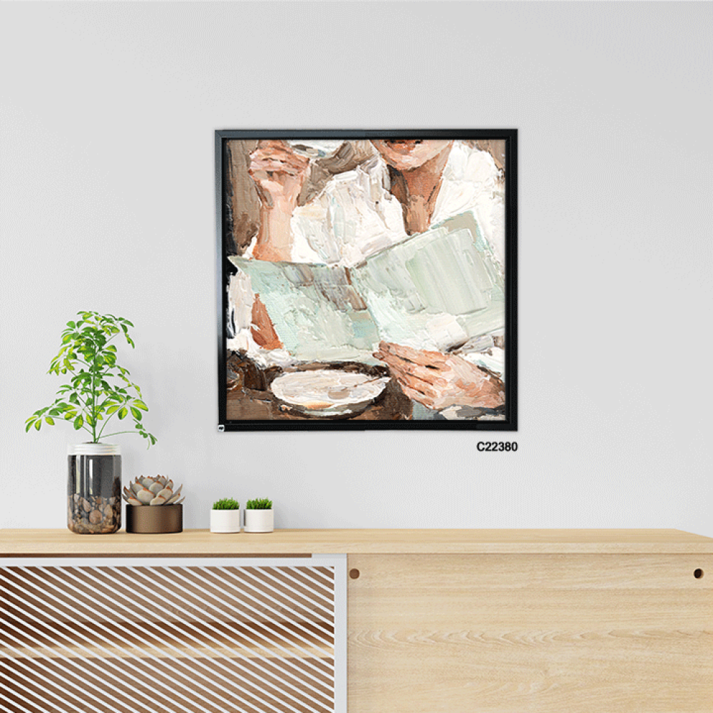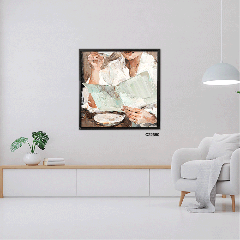 لوحة جدارية كانفس ،فتاة تقرأ وفنجان قهوة تدرجات الابيض والبني والبيج