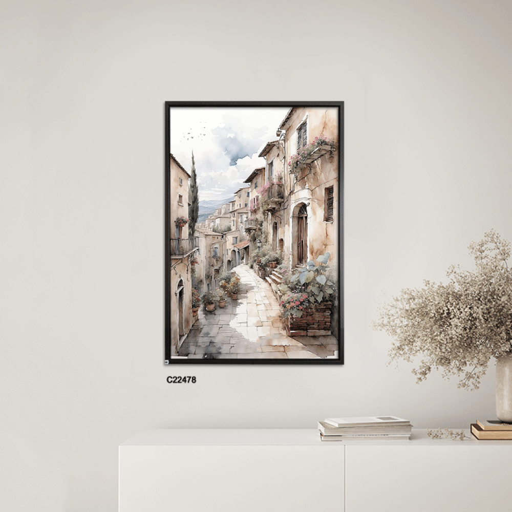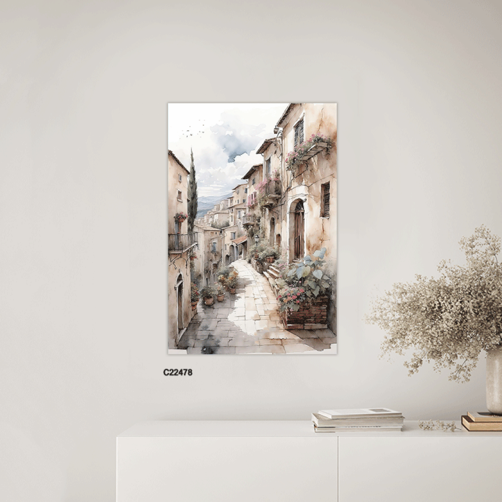 لوحة جدارية تصور بيوت قديمة بأسلوب كلاسيكي تراثي،بني وبيج